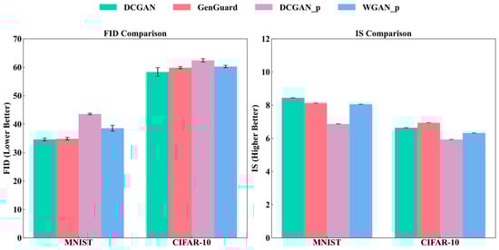 Performance comparison of FID and IS among DCGAN, Genguard, , and while generating images similar to MNINST and CIFAR-10.