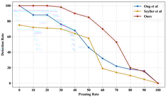 In Figure 19, the comparison experiments of the robustness under pruning attacks are conducted between GenGuard and classic protection methods proposed in [,]. It can be observed that, as the pruning rate increases, the watermark detection performance of different methods gradually decreases. In particular, GenGuard consistently maintains stable and superior detection performance throughout the pruning process, clearly outperforming methods in [,]. These results demonstrate that GenGuard for GAN models exhibits higher robustness against pruning attacks.