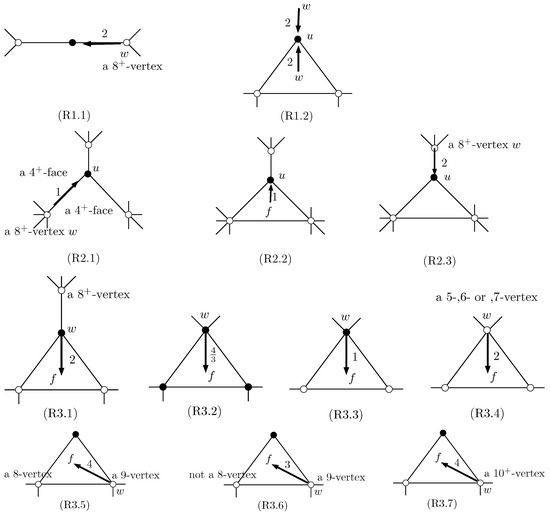 - If is a -face for all , then there is an adjacent -vertex of v which is not incident to for all by Lemma 6. It follows that . Thus, .