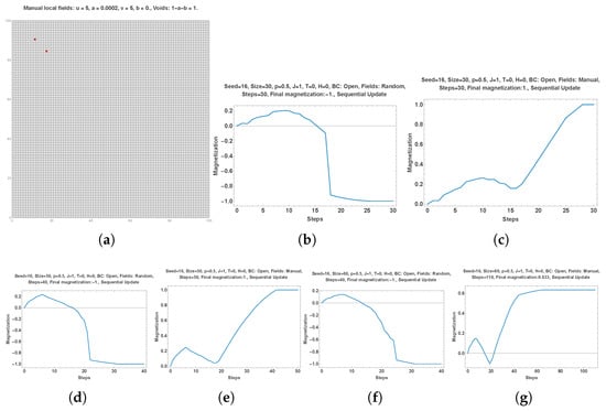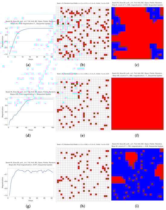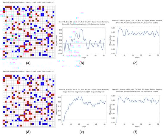 For each set of a simulation, I show several graphs including the evolution of the magnetization (numbers of +1 minus number of divided by 900) as a function the number of MC steps, the distribution of local fields used for the simulation and a distribution of individual choices after the completion of a certain number of MC steps. Red color is used for +1 and blue color for . The parameter Seed is a parameter allowing reproduction of the simulations with the same sequence of random process. Simulations were performed with local fields generated with both random and manual distributions. In the Figures, this feature is indicated with “Fields: Random” or “Fields: Manual”. The parameter Seed is indicated in the figures to allow reproduction of the simulations with the same random sequences.