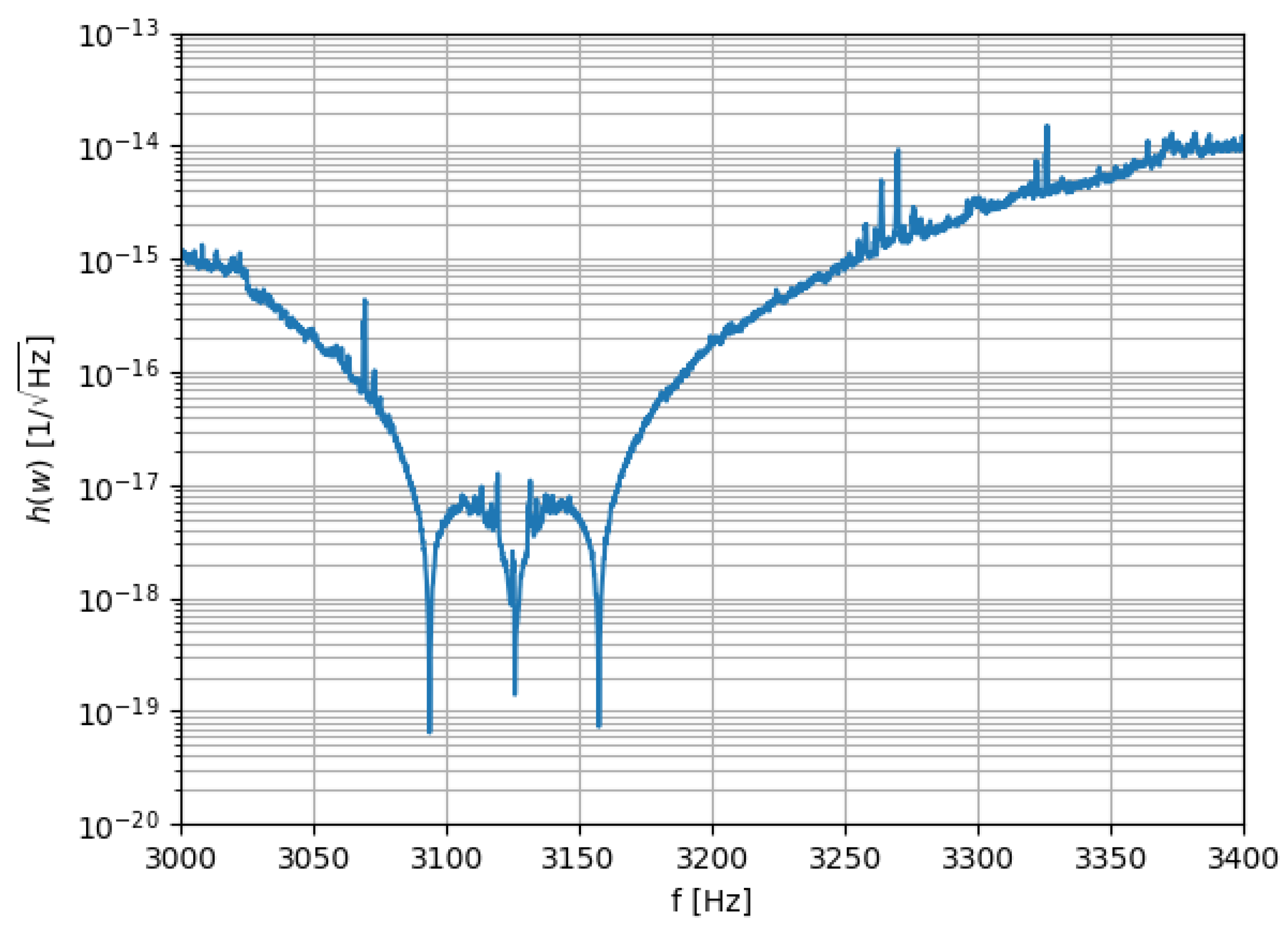 7]. The curve basically shows the energy spectrum in the output of the detector (in a convenient unit) as a function of the frequency when no gravitational wave is present, thus presenting how the coupled system behaves in the frequency domain in view of its physical characteristics. Particularly important for this study are the three lowest dips of this figure, between 3080 Hz and 3170 Hz. They indicate the frequencies of the antenna’s quadrupole modes for a perfect sphere coupled with the transducer, which we will discuss in detail below.