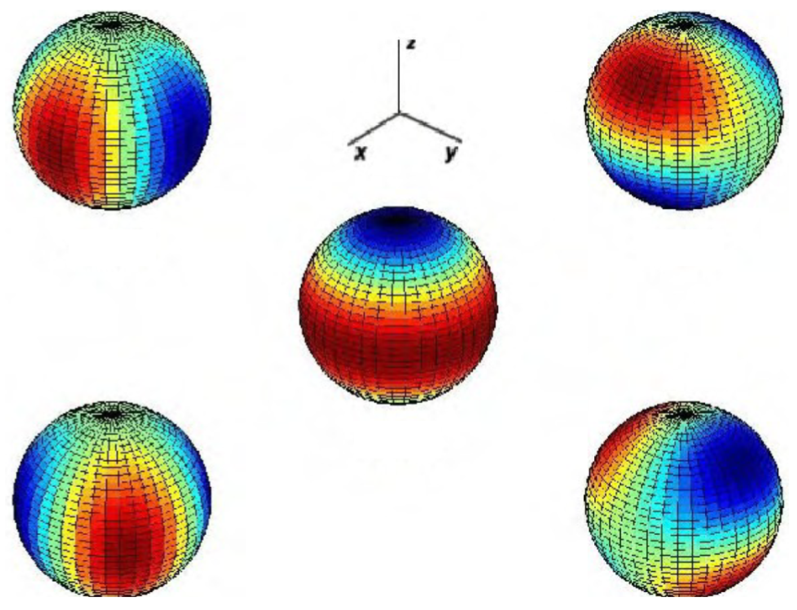 Vibrations of the quadrupole modes of the spherical antenna. The red areas vibrate in phase opposition to the blue areas. On the right is mode (prolate–oblate). On the left is mode , and a 45-degree rotation of it relative to the vertical axis yields mode . In the middle is mode , and a 45-degree rotation of it relative to the horizontal axis yields mode . The colors represents vibrations on the sphere surface, red and blue represents opposite radial movements. Source: From the authors.