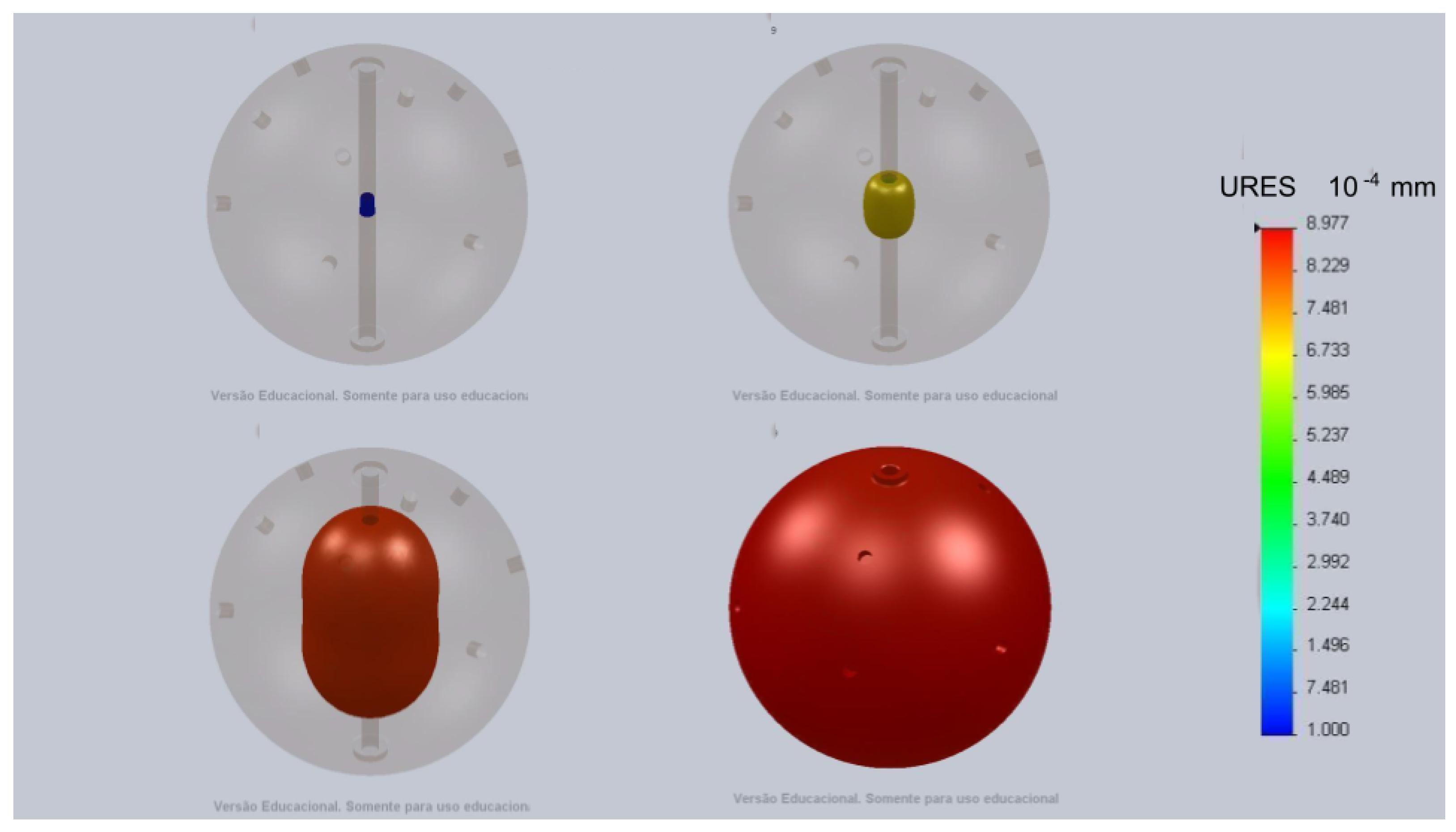 Results of the simulations showing the surfaces where the displacements have the same magnitude (iso-displacements). The final result is the sphere dropping 0.8977 micrometers. Source: The authors.