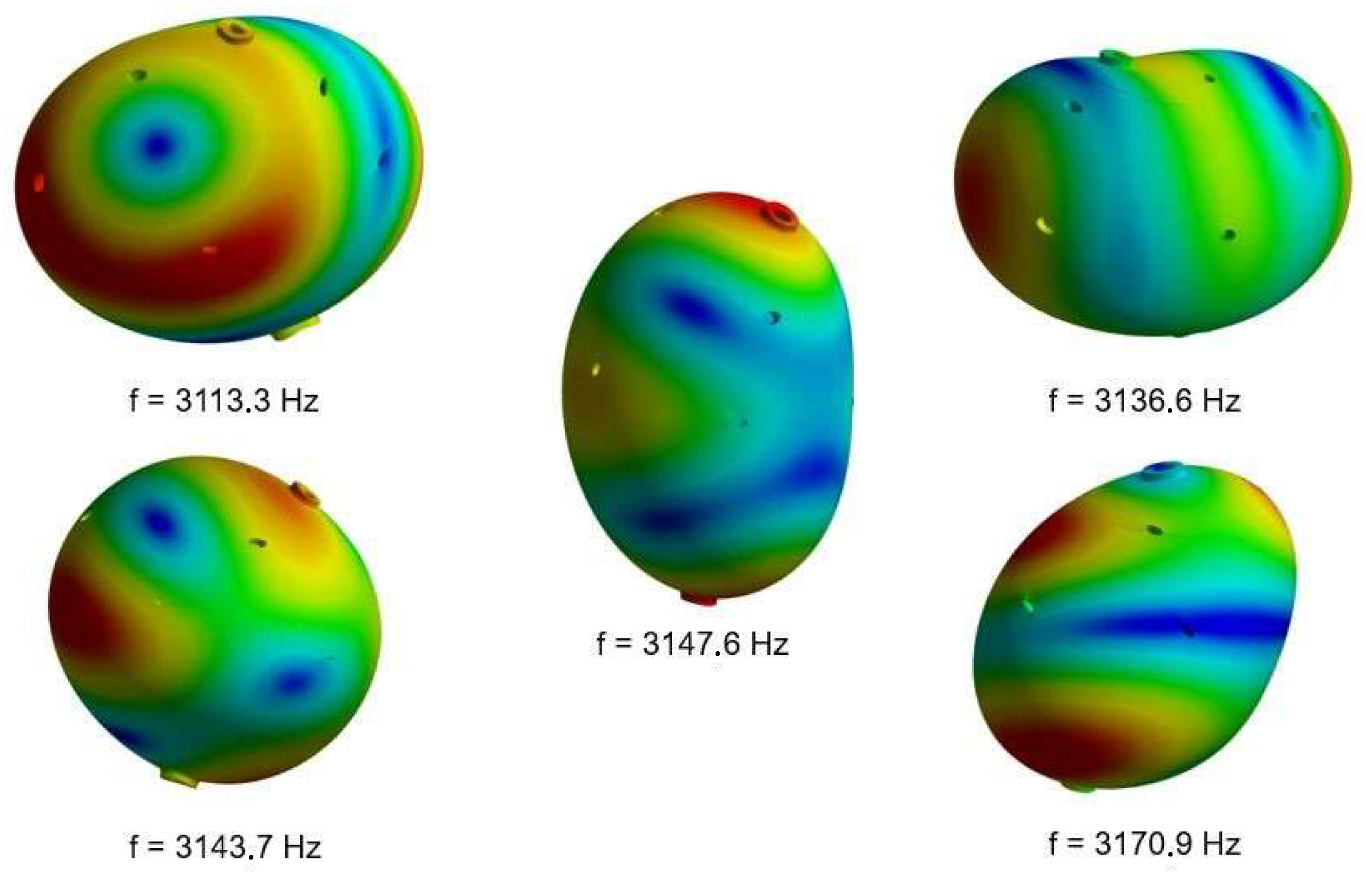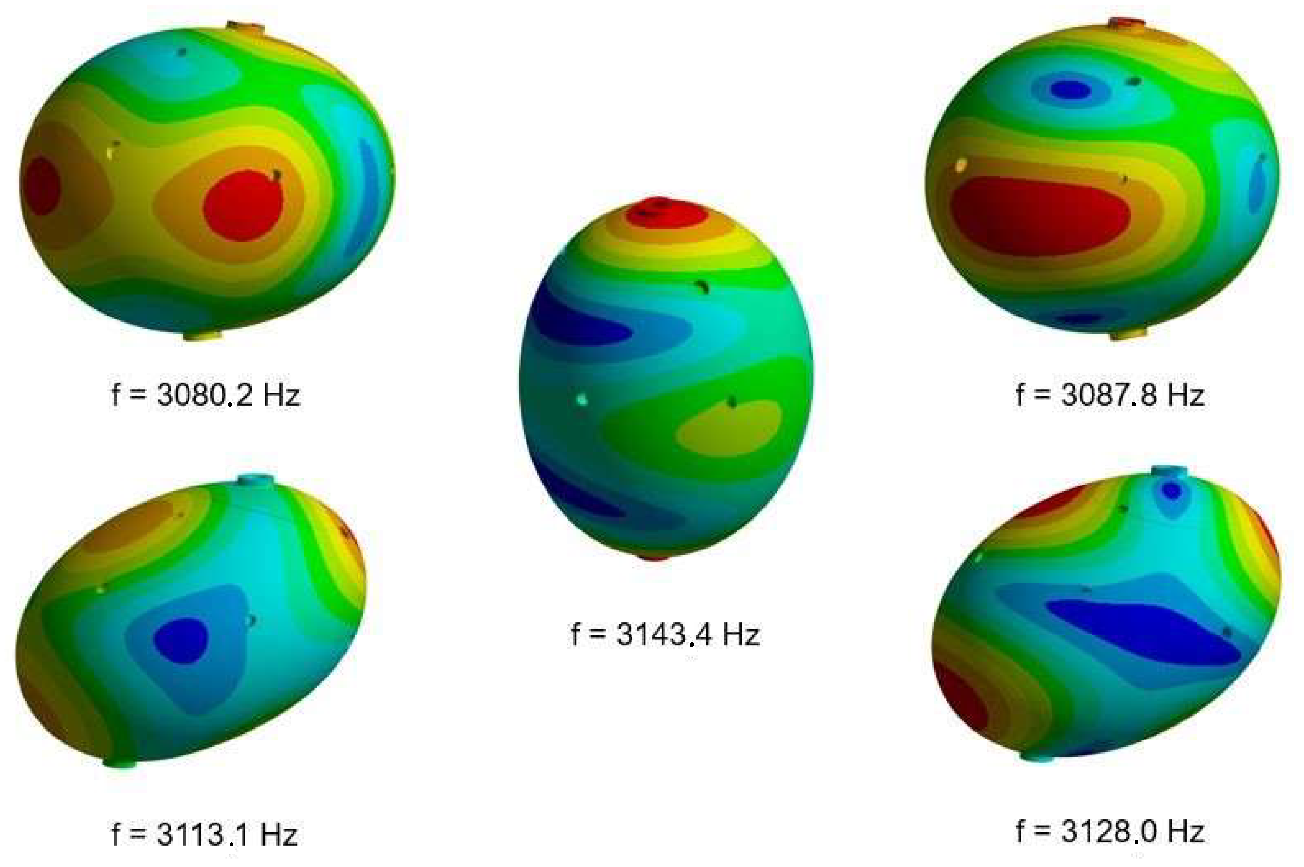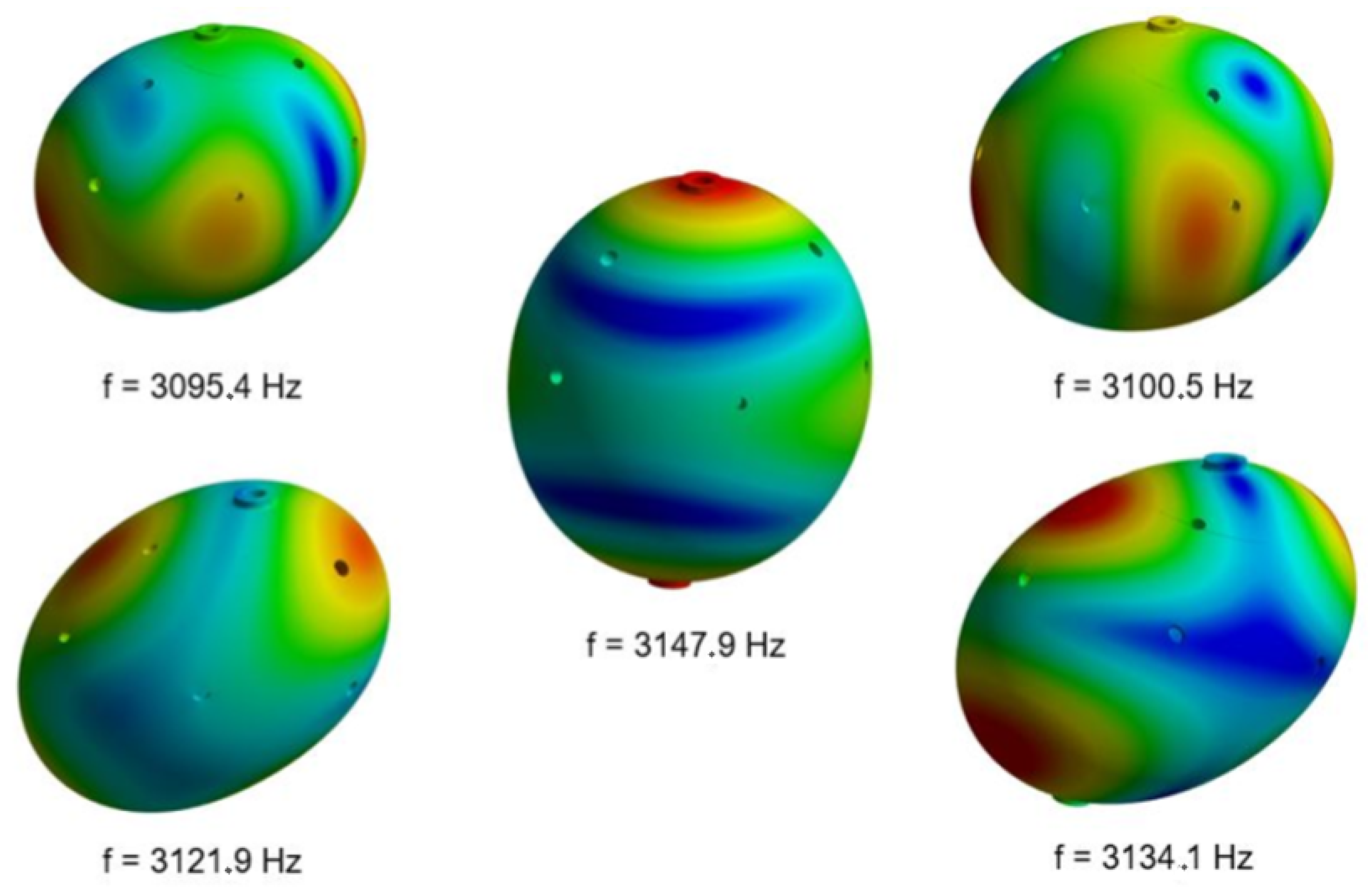 For the Sphere II case (with the largest bottom width of the external part and a 30% difference in the Young’s modulus), these are the mode shapes, with their respective frequencies and a bandwidth of 57.6 Hz. The colors represents radials oscillations of the surface, being red the opposite of blue. Source: The authors.