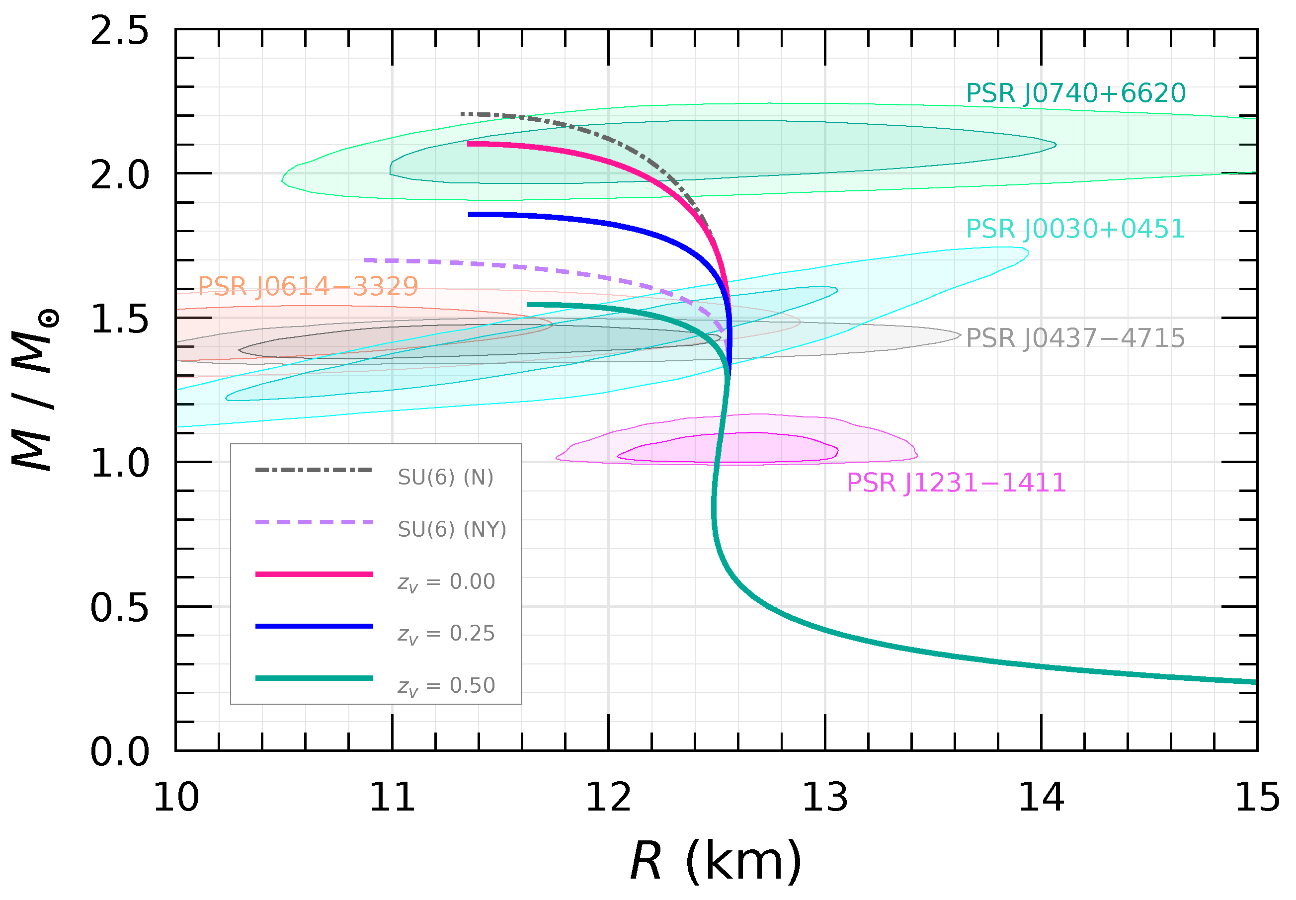 - Malik, T.; Dexheimer, V.; Providência, C. Astrophysics and nuclear physics informed interactions in dense matter: Inclusion of PSR J0437-4715. Phys. Rev. D 2024, 110, 043042. [Google Scholar] [CrossRef]