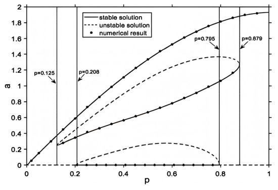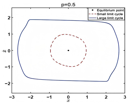 As shown in Figure 1, the bifurcation diagram in (21) with a fractional inertial element without noise excitation is essentially different from the situation with the fractional damping element. There is only one attractor if the order p varies in [0, 0.25) and (0.879, 1]: the large limit cycle. There are three attractors if the order p varies in (0.208, 0.795): equilibrium and the large and small limit cycles. There is an isolated small limit cycle that is usually difficult to capture at this time, which is also fundamentally different from the van der Pol system. There are also two attractors if the order p varies in the interval [0.125, 0.208] and [0.795, 0.879]: equilibrium and the small limit cycle. Suppose order p is p = 0.5 ; the phase diagram in Figure 2 indicates that the deterministic system is tristable at this moment, while p belongs to the interval (0.208, 0.795).