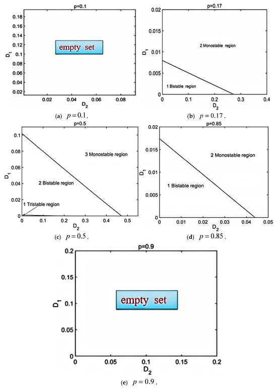 When p is selected within [0.208, 0.795), supposing p = 0.5 as an illustration, the system associated with (8) exhibits three attractors, an equilibrium, a small limit cycle, and a large limit cycle, with transition set curves subjected to two noise excitations depicted in Figure 3c. At this point, since the deterministic system is tristable, D 1 and D 2 can cause tristable properties; as D 1 and D 2 increase, the system initially transitions to bistability and then gradually shifts to monostability.