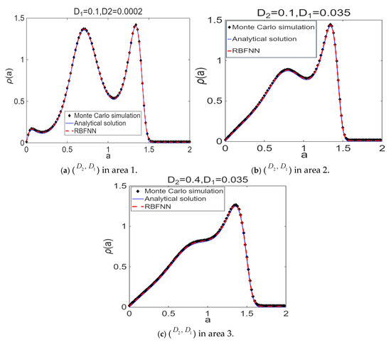 To retain generality, this paper explores the steady-state PDF ρ ( a ) with joint PDF ρ ( x ,   x ˙ ) just as ( D 2 ,   D 1 ) within the three sub-areas, as depicted in Figure 3c. Thus, we conduct comparison with the results obtained from the Monte Carlo simulations and from the Radial Basis Function Neural Network (RBFNN) based on the original system (8) utilizing [51] (Figure 4 and Figure 5), respectively.