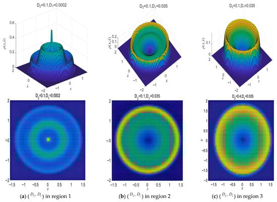 According to singularity theory, different kinds of the steady-state PDF in various ( D 2 ,   D 1 ) should be similar. Selecting ( D 2 ,   D 1 ) from one area, it is easy to derive that the different types in the steady-state PDF are distinct. Transition set curves divide the unfolding parametric plane into two distinct sub-areas, and, for clarity, each area (Figure 3) is labeled as one number.