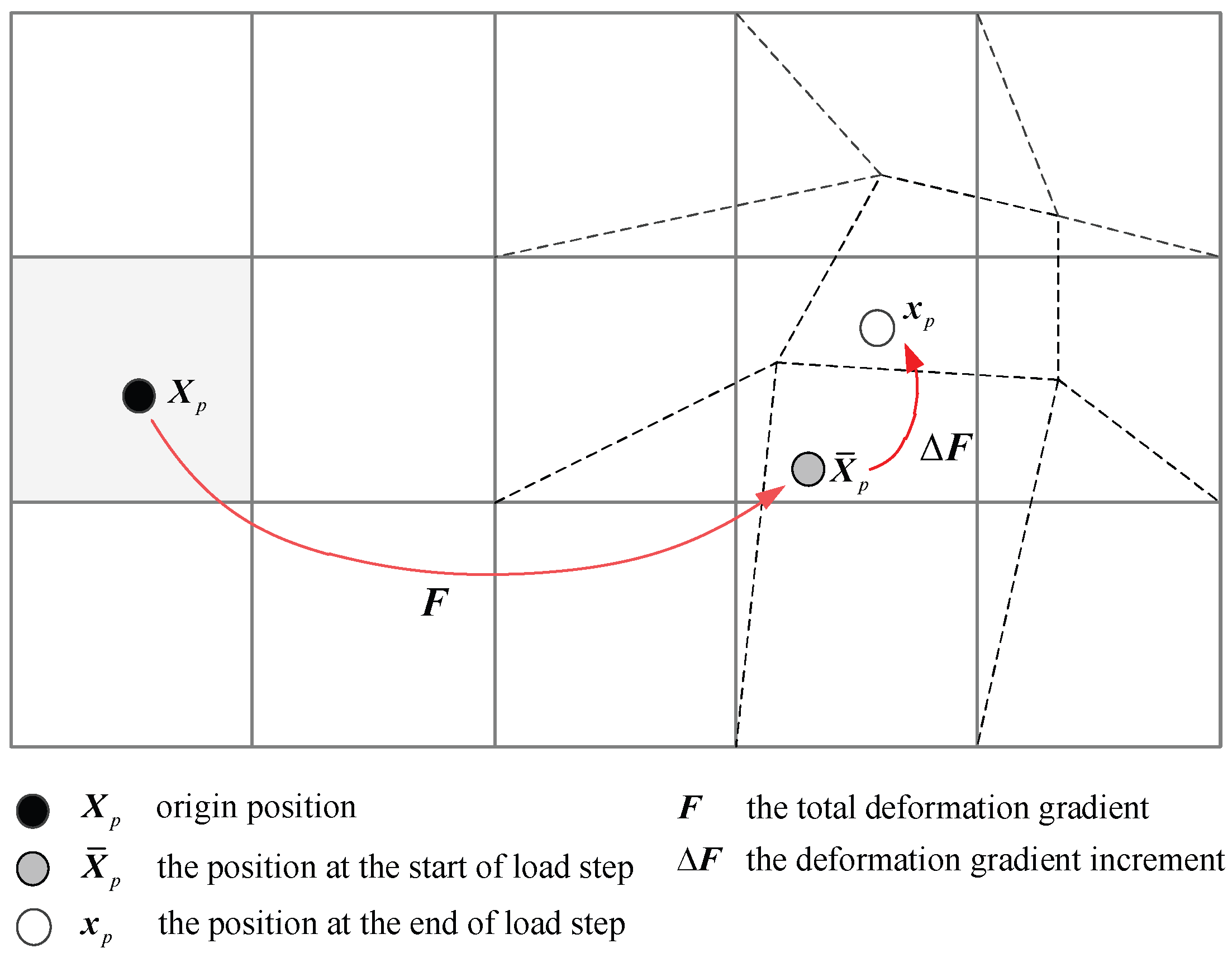 | 2.5 | The increment deformation gradient, strain, and stress of each particle is evaluated |
