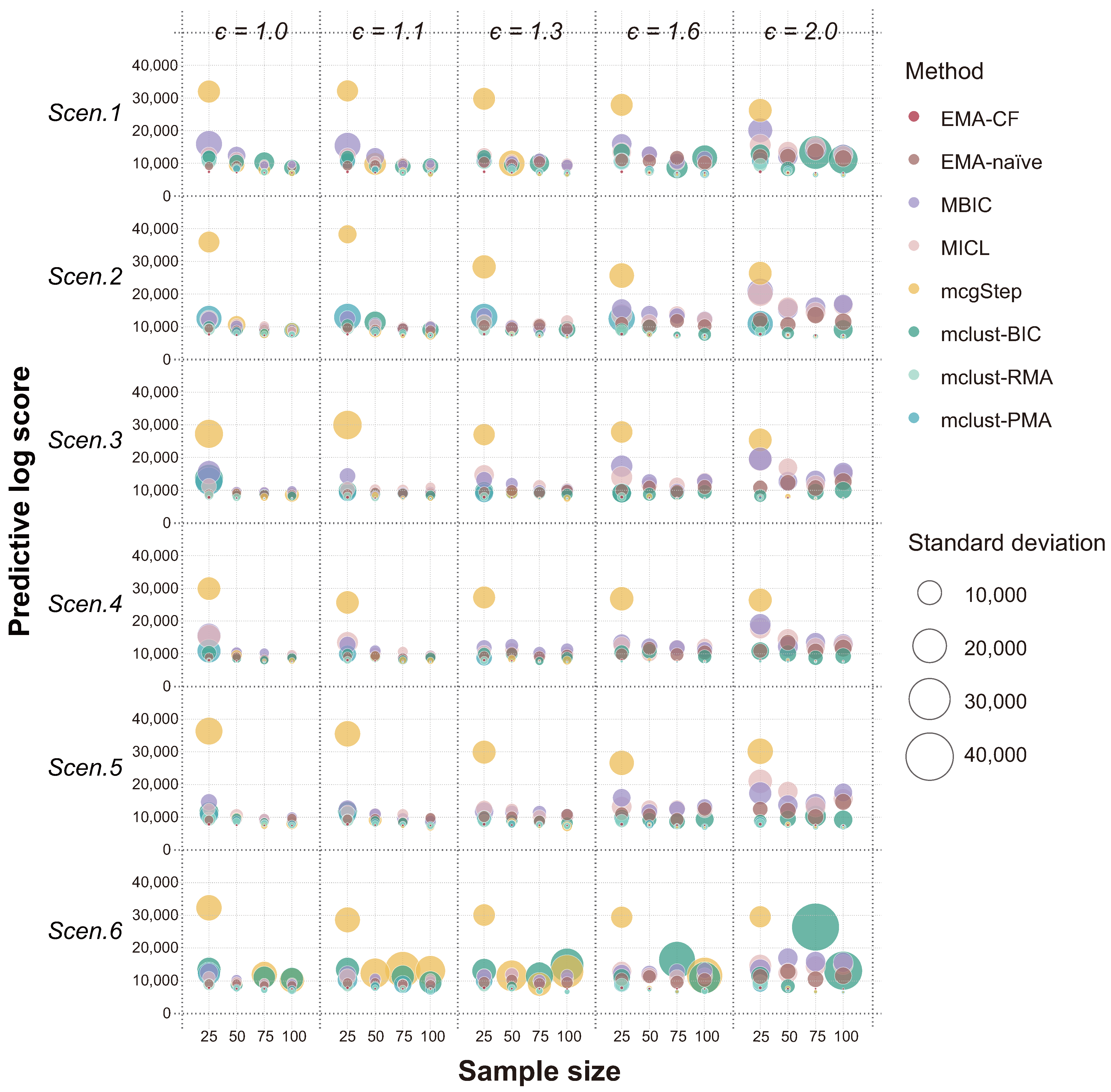 Figure 3. The radius of each circle indicates the variation of the PLS values over the twenty replicates. The EMA-CF method shows remarkably high predicting performance across different covariance structure configurations. And, the results are robust across various simulation settings. Particularly, using EMA-CF reduces the PLS of EMA-naïve in each case, which suggests the significance of modeling the within-component correlations.