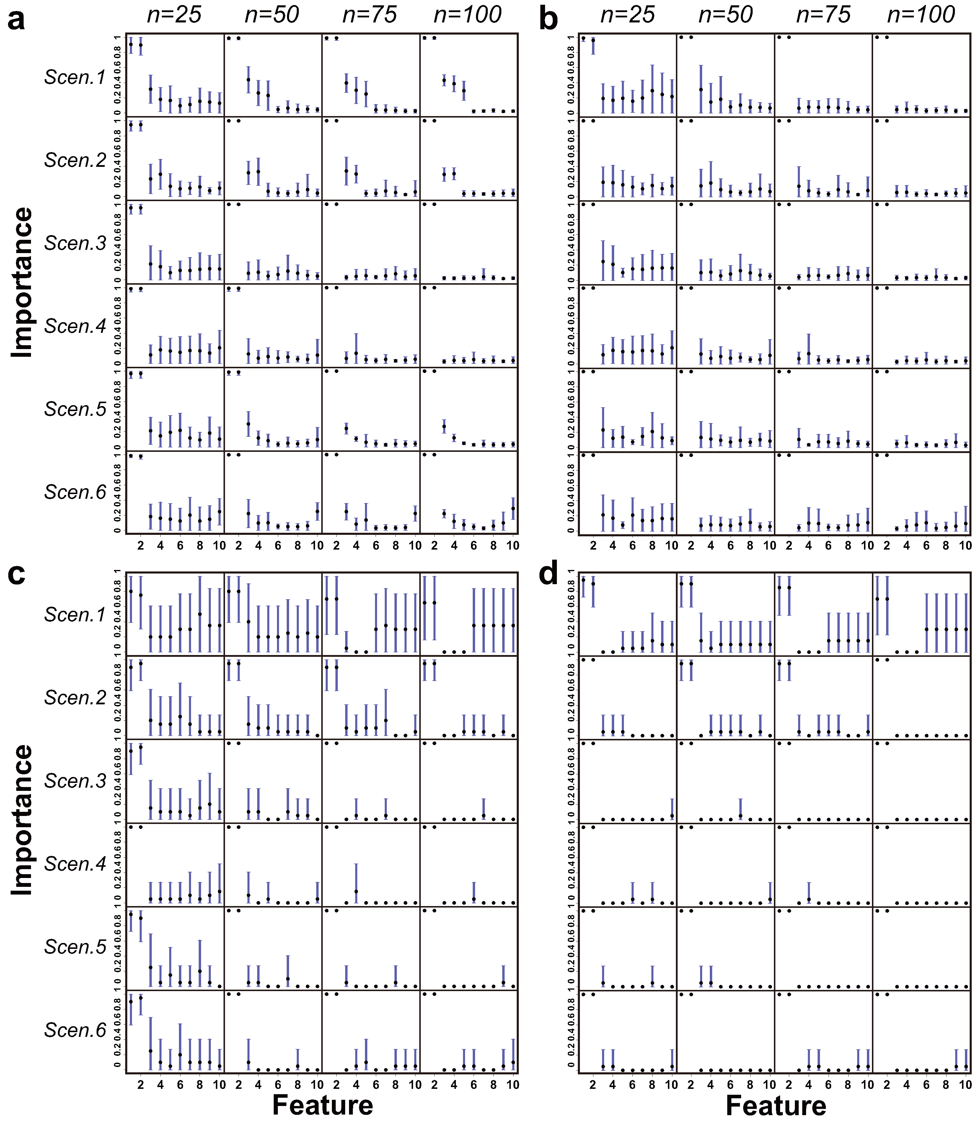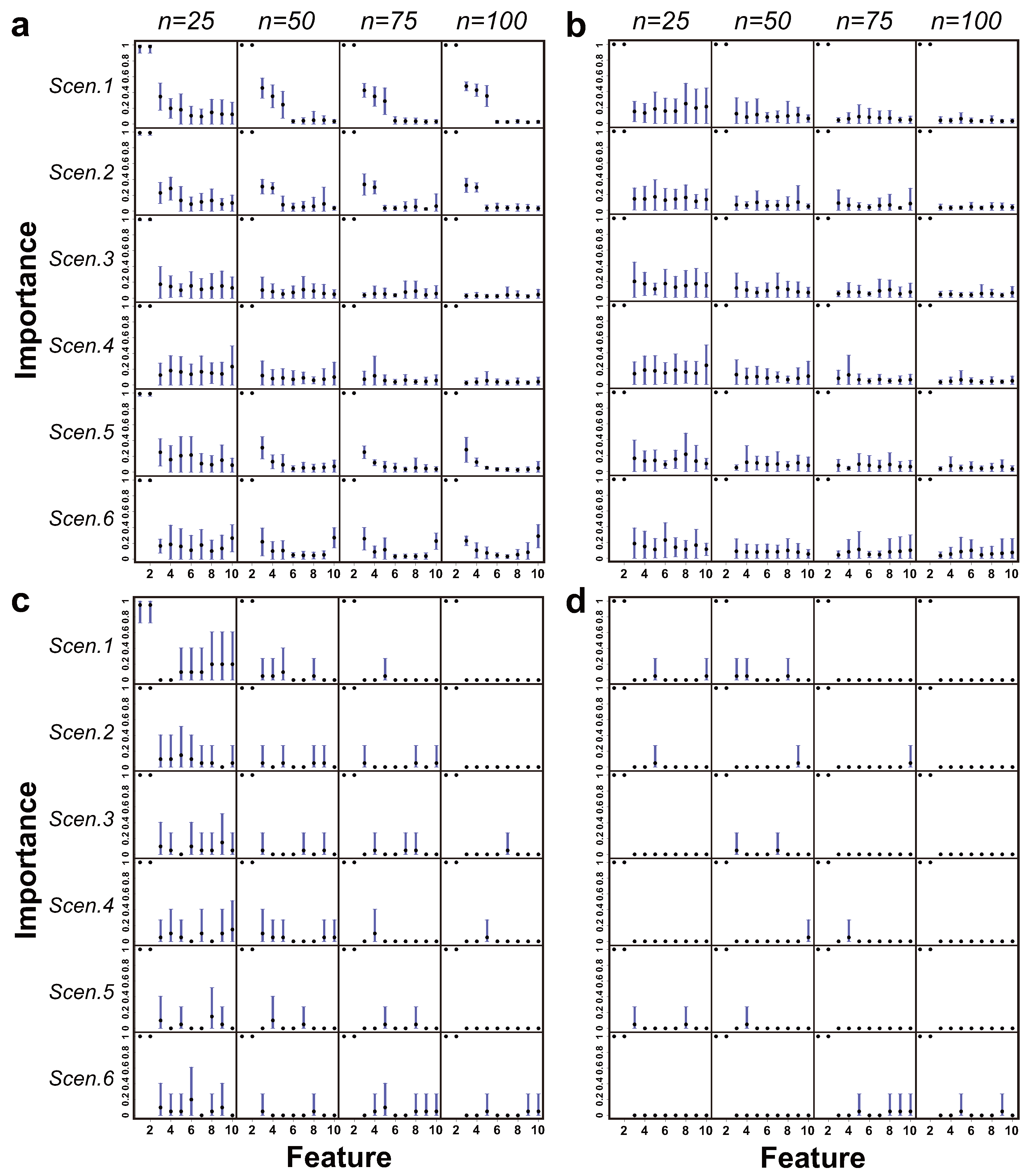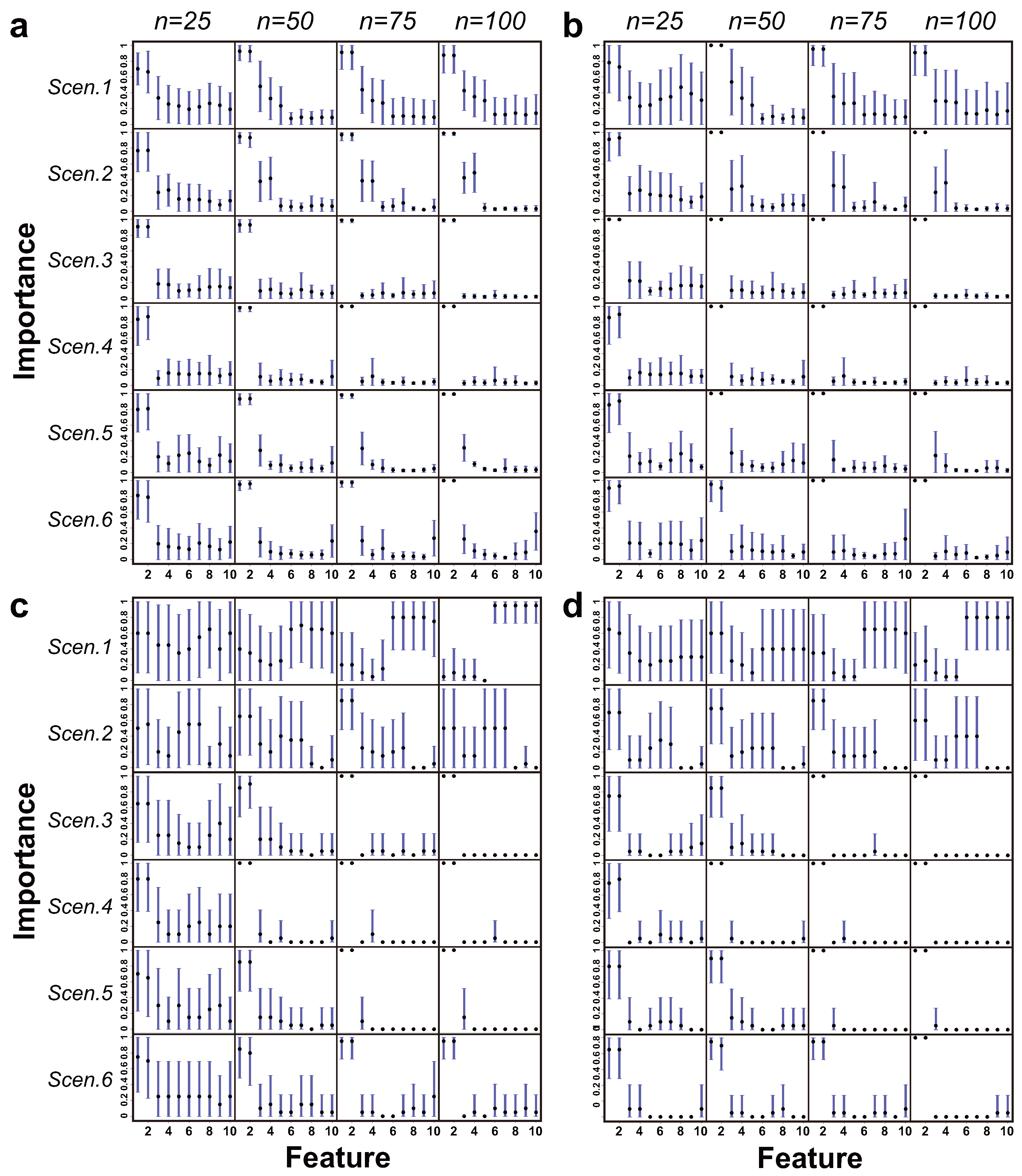 Figure 7 show the patterns of feature importance estimated by the EMA-CF, EMA-naïve, MBIC, and MICL methods under class overlap settings of
