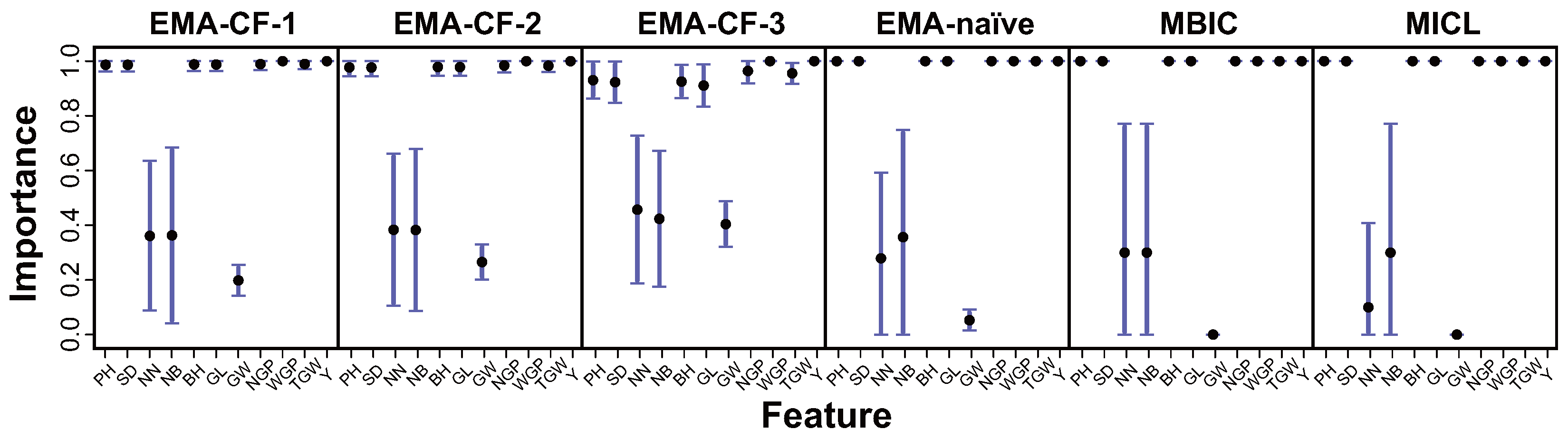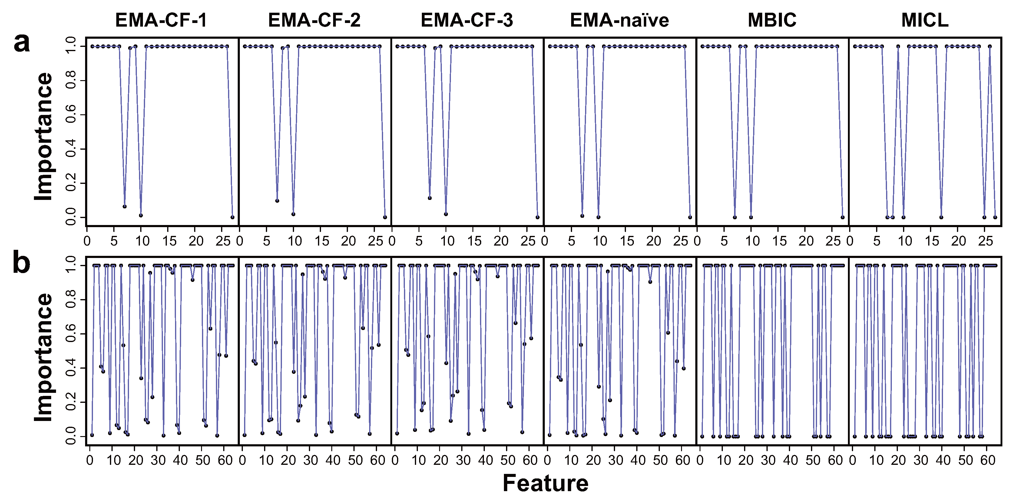 Figure 9. While the MBIC and MICL methods separate the features as discriminating and undiscriminating, EMA-CF and EMA-naïve give relatively conservative estimations of feature importance by taking into account model uncertainty with BMA. There are no apparent differences between the results of EMA-CF andEMA-naïve, which agrees with the sparse patterns of feature association in the two datasets, as detected in