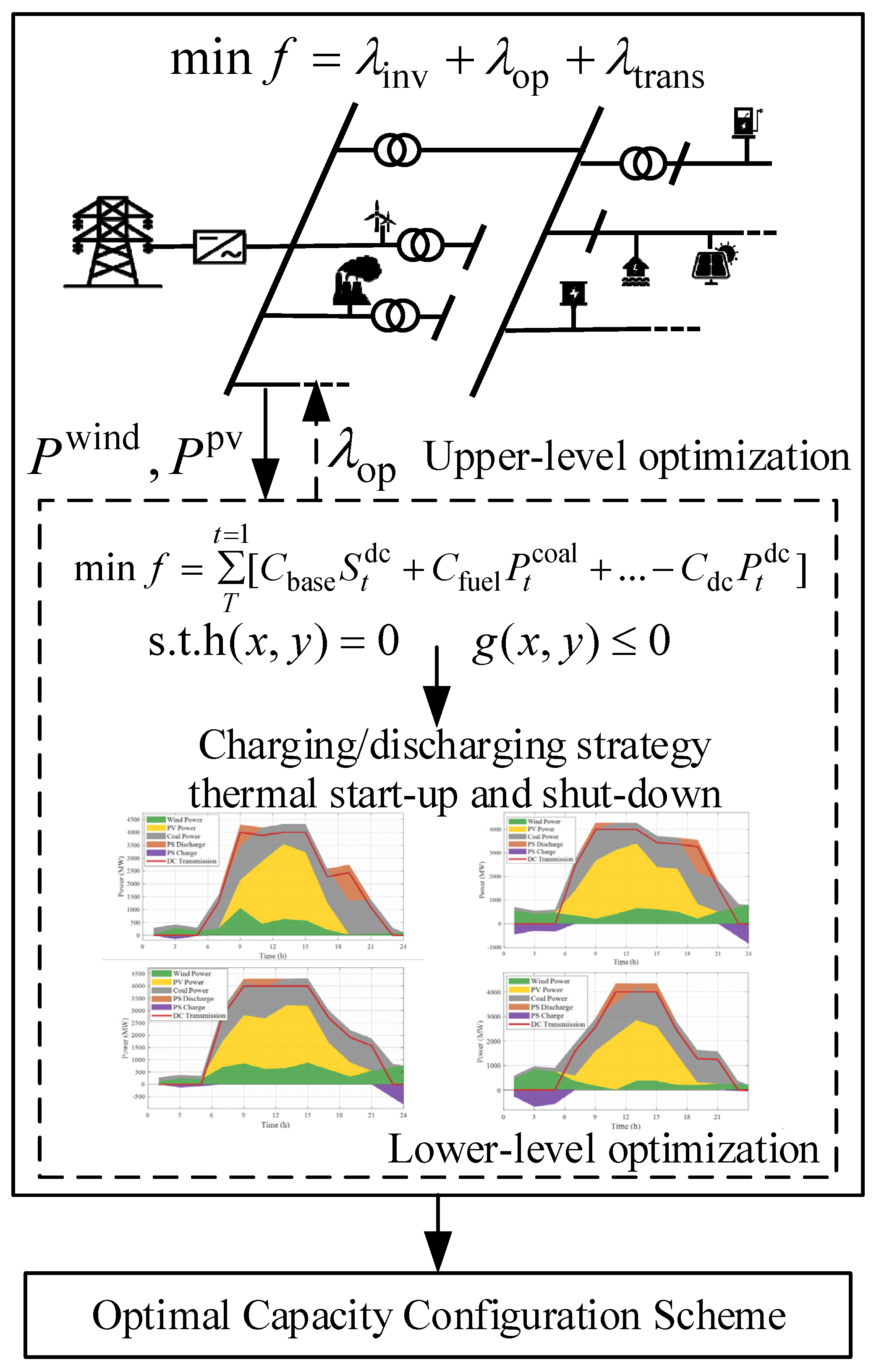 - A bilevel optimization framework is developed to co-optimize long-term capacity expansion and short-term operational scheduling for the IETS. This structure is computationally tractable and accommodates a full-year simulation, effectively accounting for the stochastic nature of wind and PV power. Specifically, the upper level determines the optimal capacity configuration. It achieves this with a single, market-driven objective: minimizing the delivered electricity price. This approach entirely avoids subjective trade-offs between conflicting goals. Meanwhile, the lower level minimizes the annual operational cost through the optimal dispatch of thermal units and pumped-storage operation. This is performed under system power supply reliability and renewable curtailment constraints, achieving an optimal balance between long-term market competitiveness and short-term operational security.