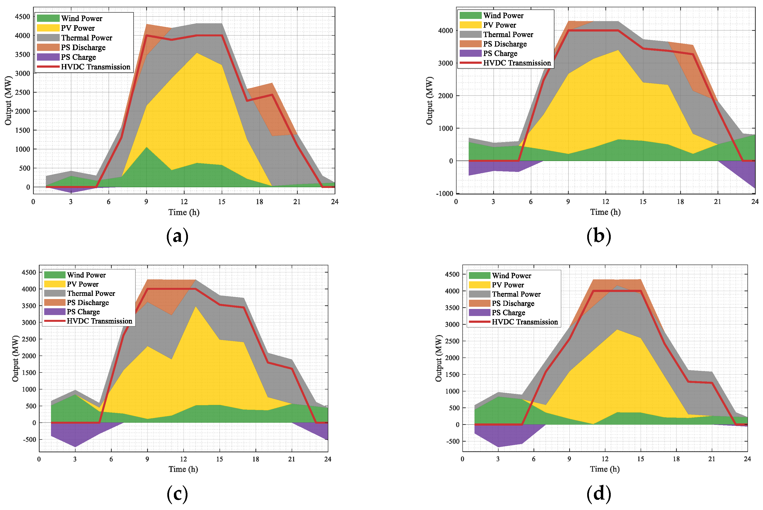 - The constraints of HVDC utilization duration, as given in Equation (23).where is a binary variable where = 1 if the HVDC transmission power is adjusted at hour t, and = 0 otherwise. denotes the minimum required duration for which the HVDC power must remain constant. These variables are introduced to represent the operational constraint that large-capacity HVDC systems cannot frequently adjust their power setpoints due to stability and coordination requirements. Equation (22) ensures that the power schedule is allowed to change at most once during the specified minimum adjustment period. Additionally, according to relevant national policies and existing research, the annual utilization duration of the HVDC corridor is set to 4400 h. This value corresponds to an annual utilization rate of approximately 50% (8760 × 0.5 ≈ 4380 h) and is consistent with planning targets reported in the recent literature.