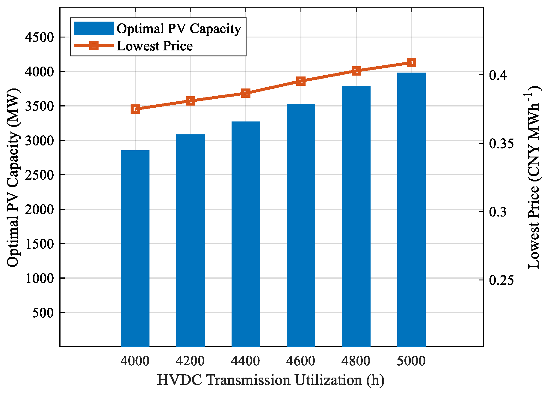 | HVDC Transmission Utilization (h) | PV Capacity (MW) | Lowest Price (CNY MWh−1) | HVDC-Exported Energy (Billion kWh) | fRPS | fAEP |