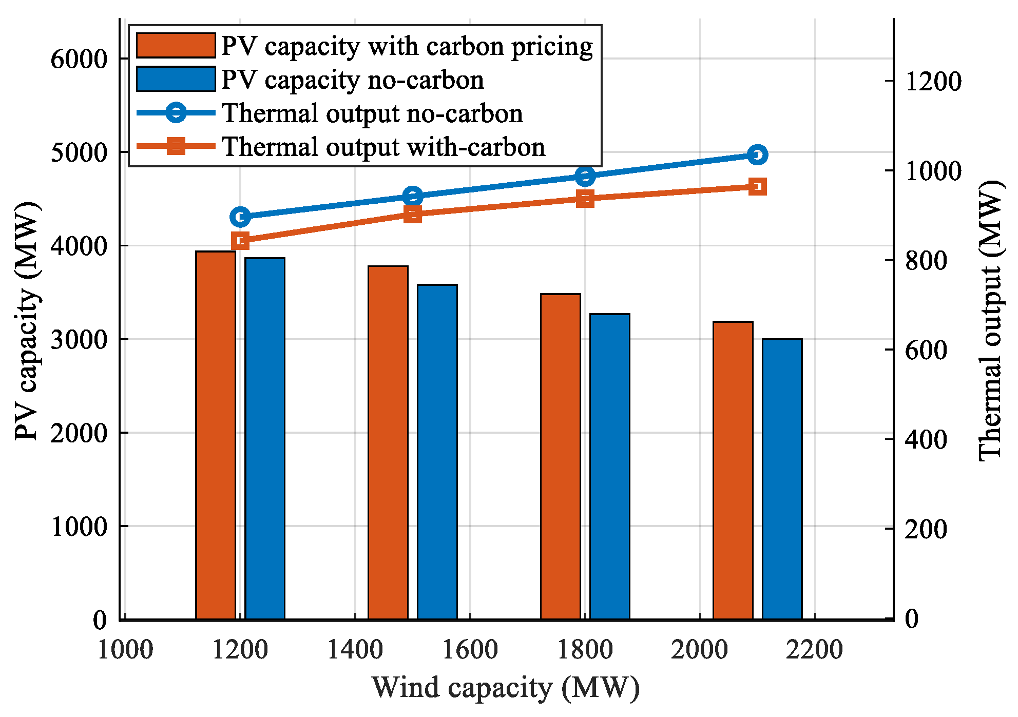 (CNY·tCO2−1) | PV Capacity (MW) | Lowest Price (CNY MWh−1) | Thermal Output (MW) | fRPS | fAEP |