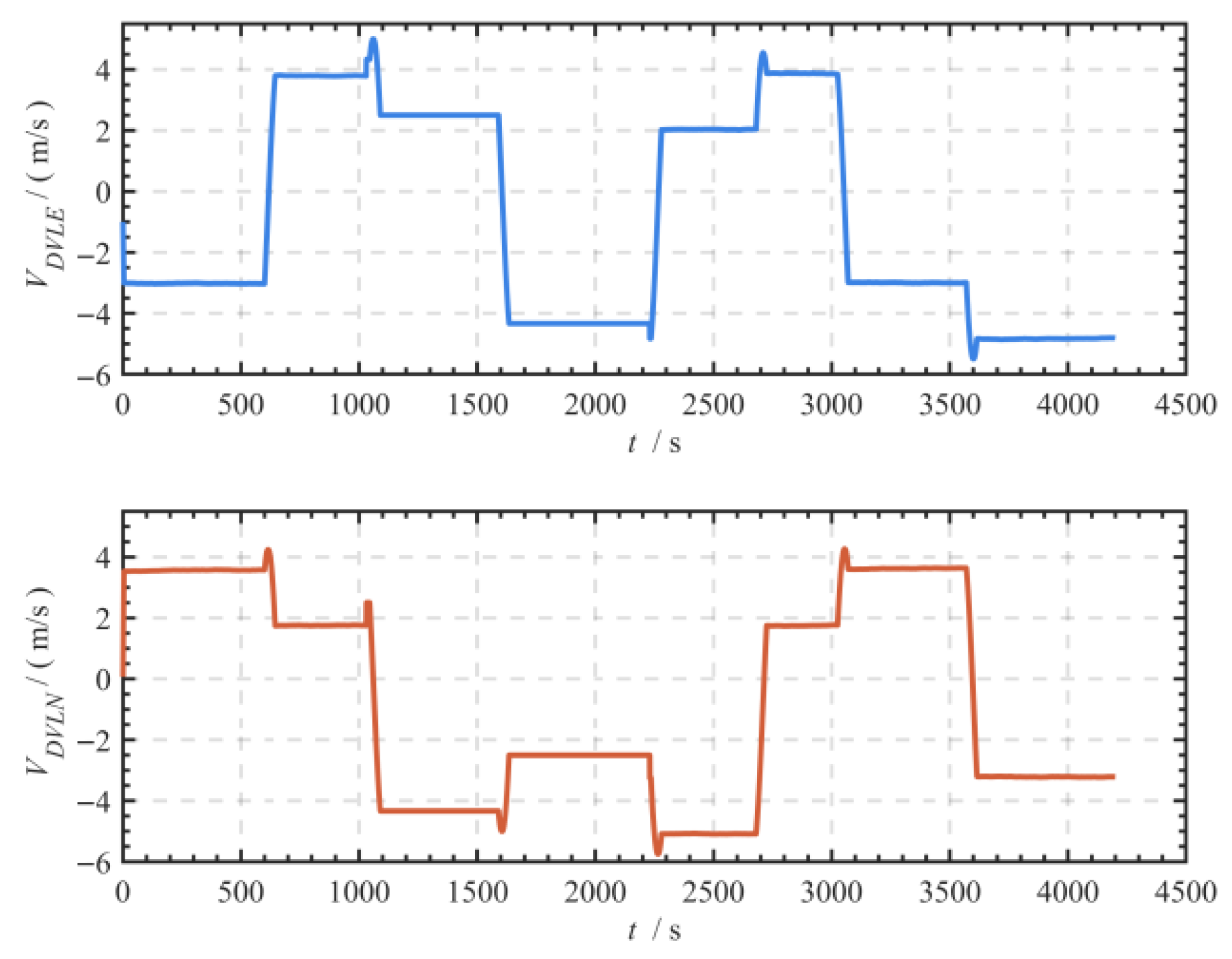 Figure 4. The DVL operates in a mode with intervals of water-to-water and bottom-to-bottom observations, including water-to-water observation phases from 1 s to 1030 s; simultaneous water-to-water and bottom-to-bottom observation phases from 1031 s to 2230 s, and simultaneous water-to-bottom observation phases from 2231 s to 4200 s. The DVL output provides the velocity information under the carrier system. The DVL velocity information under the constructed navigation system is illustrated in