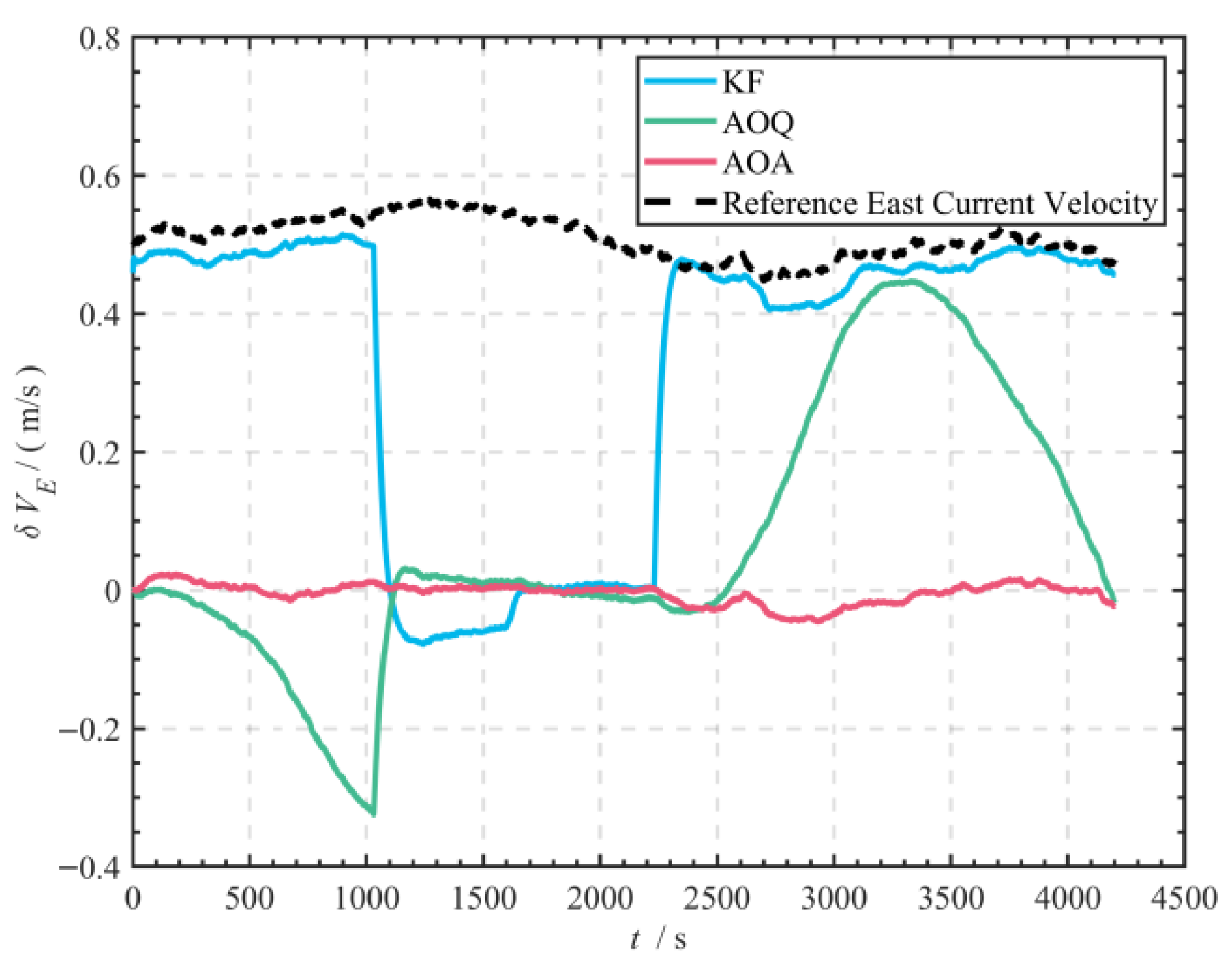 The velocity errors obtained from uncompensated DVL for water observation velocity matching are highly consistent with the time-frequency characteristics of currents (correlation coefficient reaching 0.60). After compensation using the AOQ method, the RMSE of the eastward velocity errors obtained from bottom observation velocity was reduced by approximately 48.36% relative to the KF algorithm, with the mean value decreasing by approximately 87.26%, the maximum value decreased by approximately 13.03%; the RMSE of northward velocity errors decreased by approximately 95.06%, the mean decreased by approximately 97.32%, and the maximum value decreased by approximately 92.44%. Notably, the AOA method demonstrated superior convergence characteristics compared to the AOQ method, with the RMSE of eastward velocity errors reduced by approximately 92.68% relative to the AOQ algorithm, the mean decreased by approximately 89.83%, and the maximum decreased by 89.71%, the northward velocity error RMSE decreased by approximately 70.97%, the mean decreased by approximately 73.68%, and the maximum decreased by 63.08%.