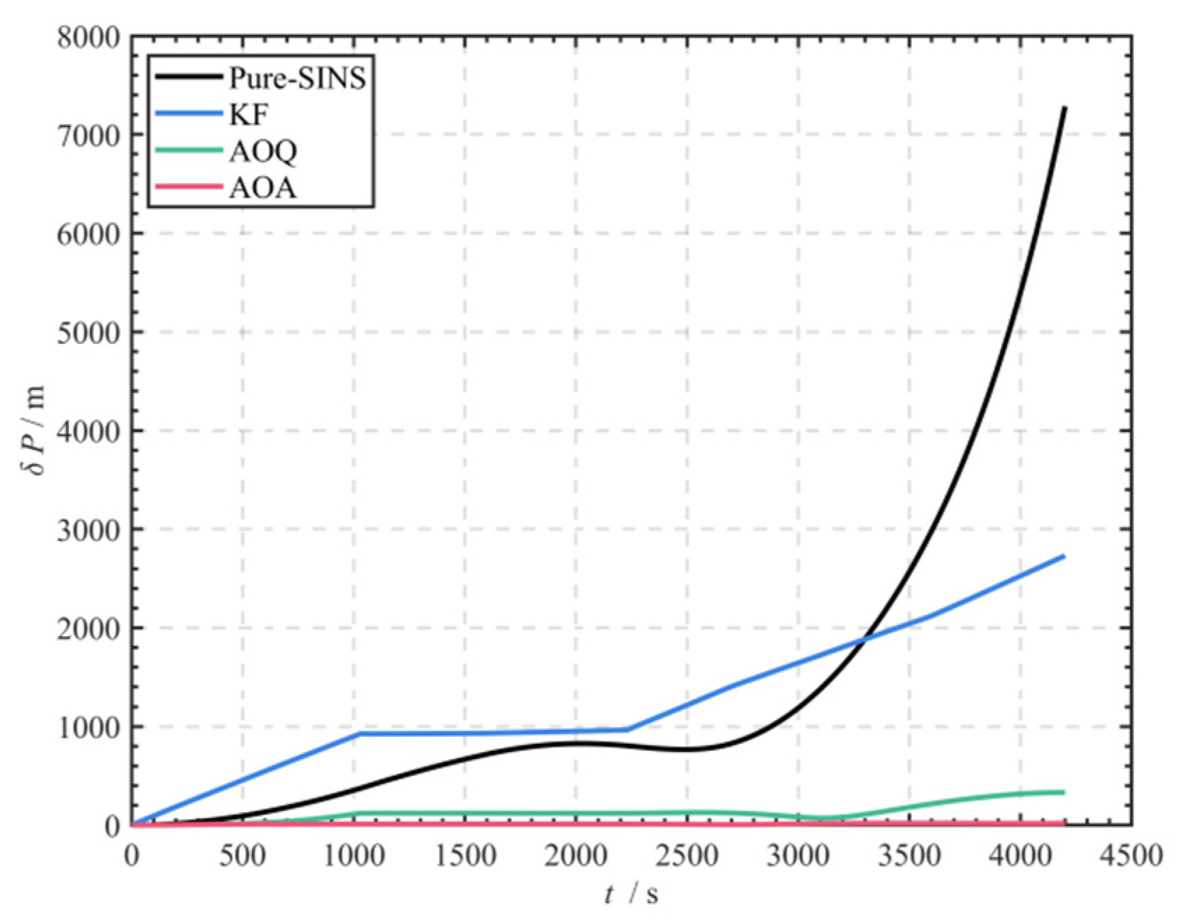 27] is utilized to compare the current velocity estimation with that of the AOA. Additionally, the SINS/DVL velocity matching is performed based on this, and the simulation results are obtained as follows under the specified simulation conditions: