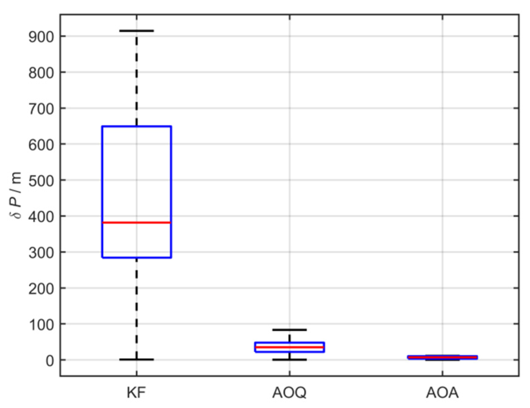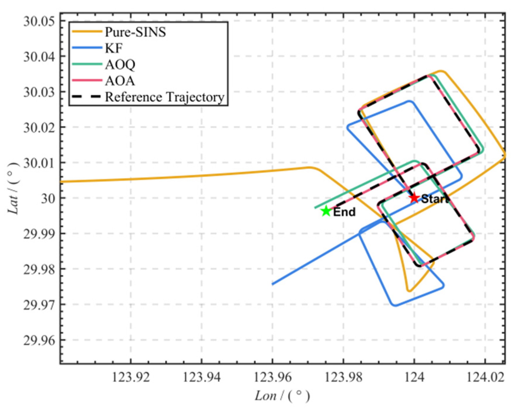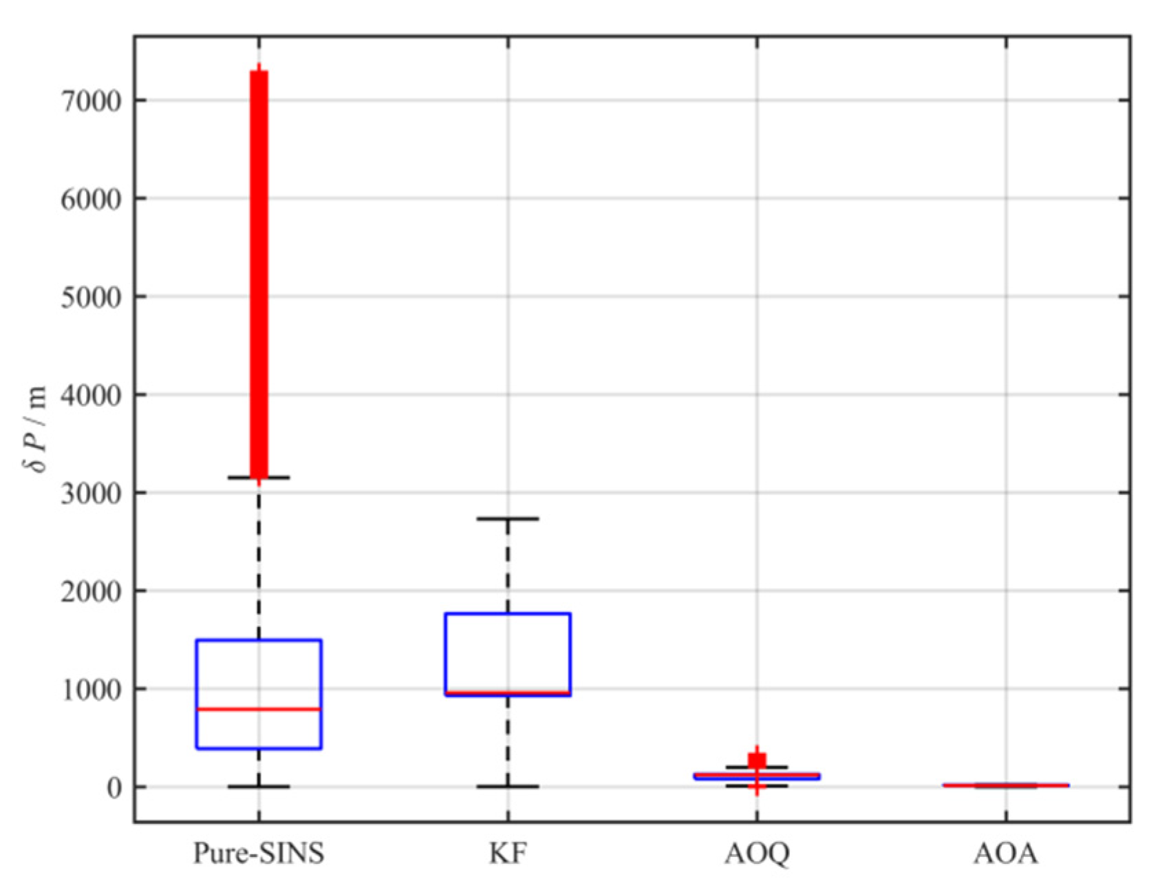 Table 3). Without current compensation, the positioning error of the SINS/DVL velocity matching method (RMSE 2733.487 m) is comparable to that of the pure inertial navigation solution (RMSE 7293.011 m). The compensated methods significantly enhance navigation performance: the AOQ algorithm reduces latitude position error by approximately 95.53% (RMSE 1216.898 m → 54.409 m) and longitude error by about 80.95% (RMSE 726.014 m → 138.272 m); in comparison, the AOA algorithm achieves even greater error reduction: latitude position error is further reduced by approximately 86.37% (RMSE 54.409 m → 7.414 m) based on the AOQ algorithm, and longitude error decreases by around 91.76% (RMSE 138.272 m → 11.398 m). The box plot (
