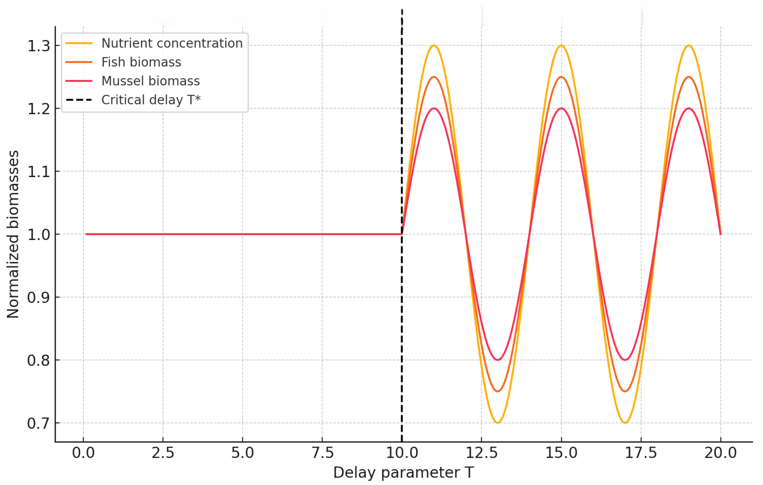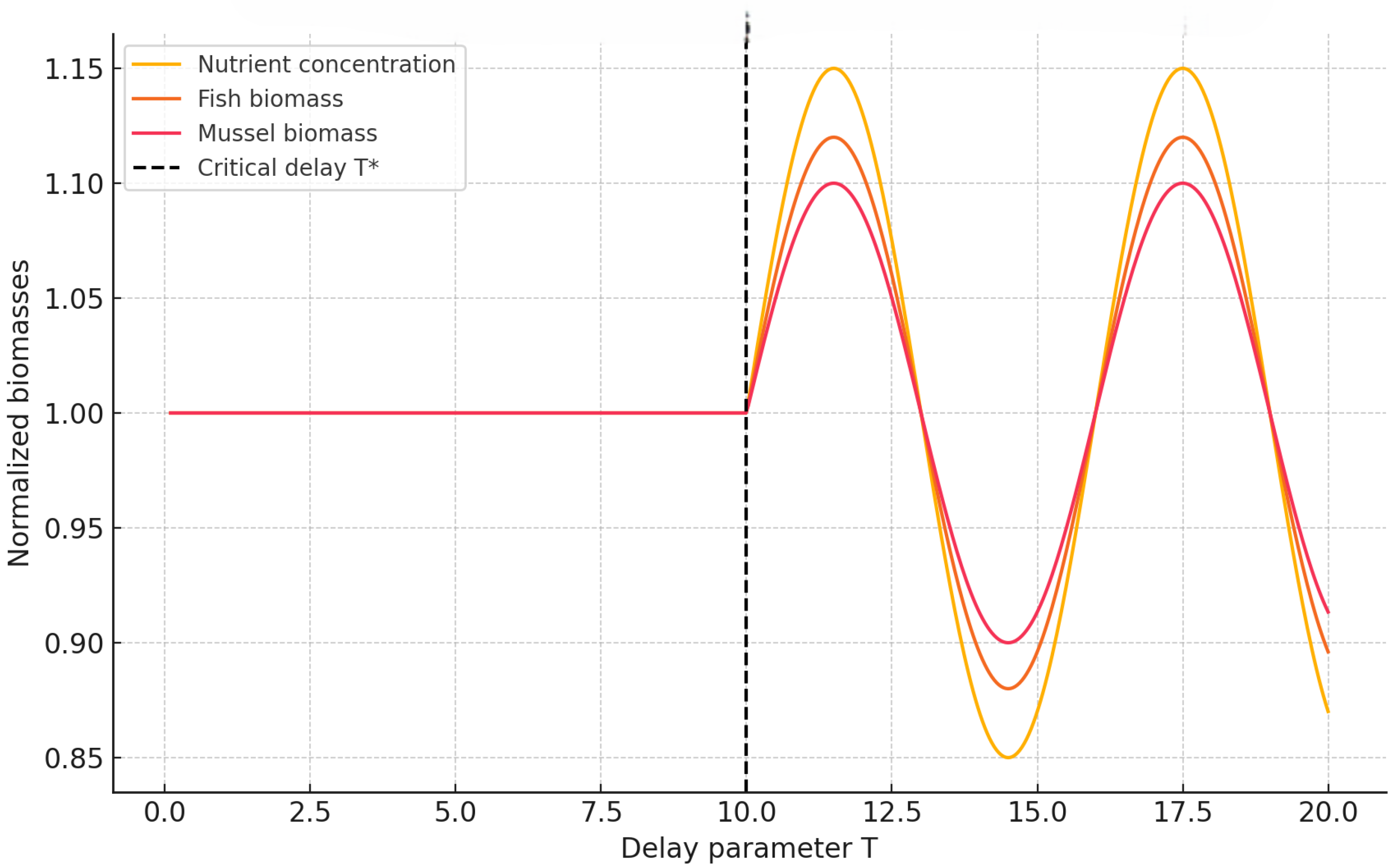 19] developed a spatially explicit model to evaluate the nutrient mitigation potential of blue mussel farms in the western Baltic Sea, capturing the interaction between hydrodynamic transport, particulate nutrient dispersion, and mussel biofiltration. Their work illustrates how mussel farms can function as ecological infrastructure to alleviate eutrophication near fish farming zones, offering practical insights into the integration of spatial processes in IMTA planning. These frameworks, though structurally diverse, complement the distributed-delay approach by capturing additional dimensions of ecological realism, be it memory, behavior, stoichiometry, or space, essential for understanding resilience, bifurcations, and stability in multitrophic aquaculture systems.