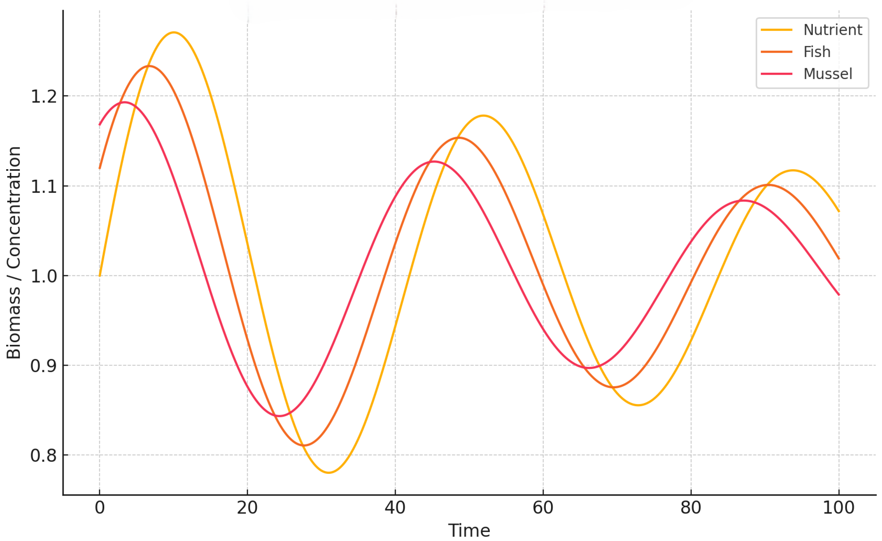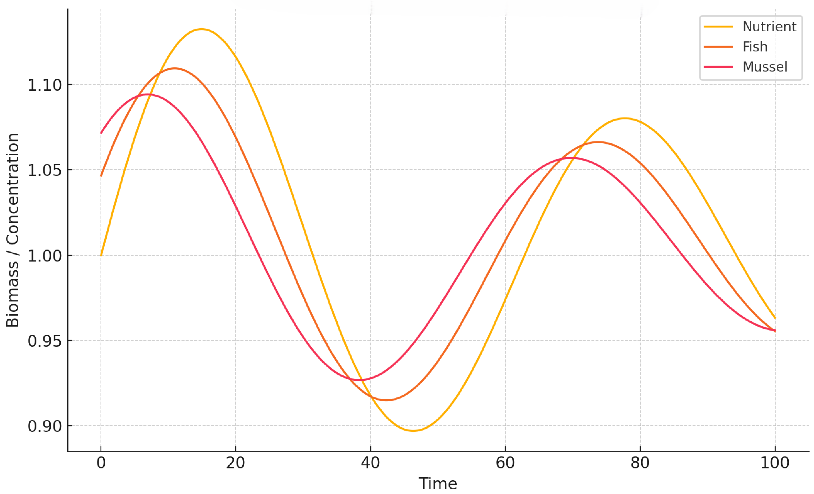 1) represents the interplay among nutrient availability, fish growth, and mussel biofiltration, capturing essential feedback mechanisms in multitrophic aquaculture systems.
