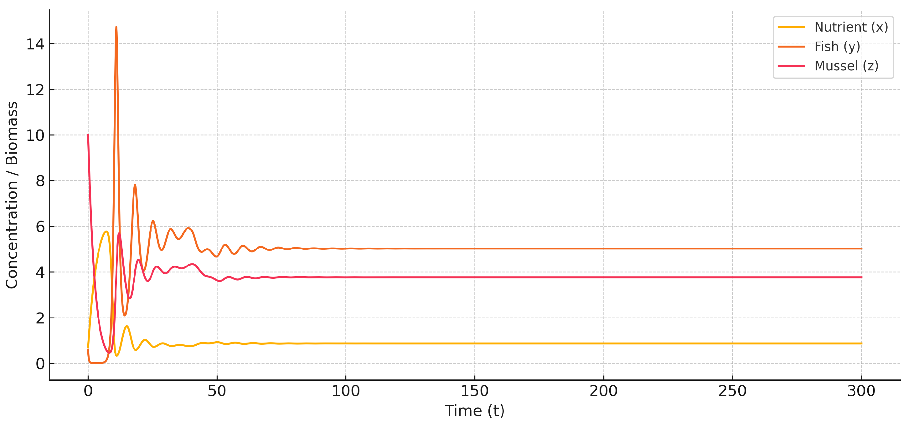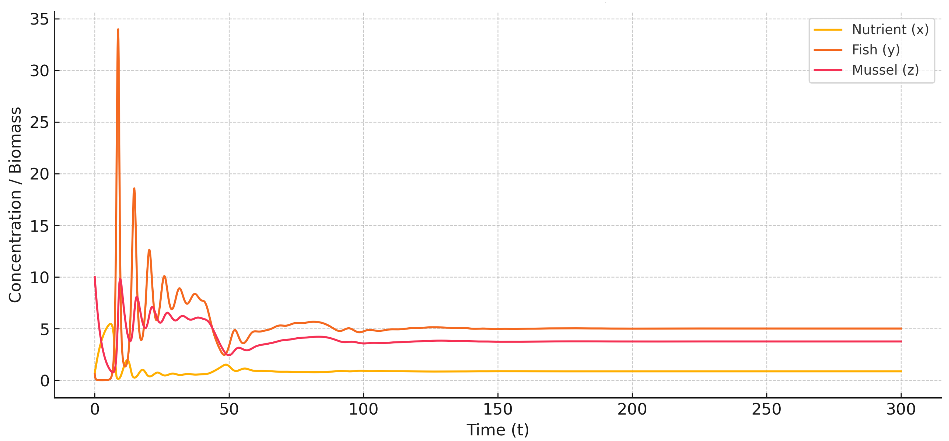 1]. Mussels act as natural biofilters, improving water quality by removing excess nutrients, particularly nitrogen and phosphorus, which are central to eutrophication and water degradation. This ecological service makes mussels key components in integrated multitrophic aquaculture (IMTA) systems. Mathematical models play a crucial role in understanding and optimizing the dynamics of such systems, providing quantitative insights into nutrient cycling, species interactions, and long-term stability.
