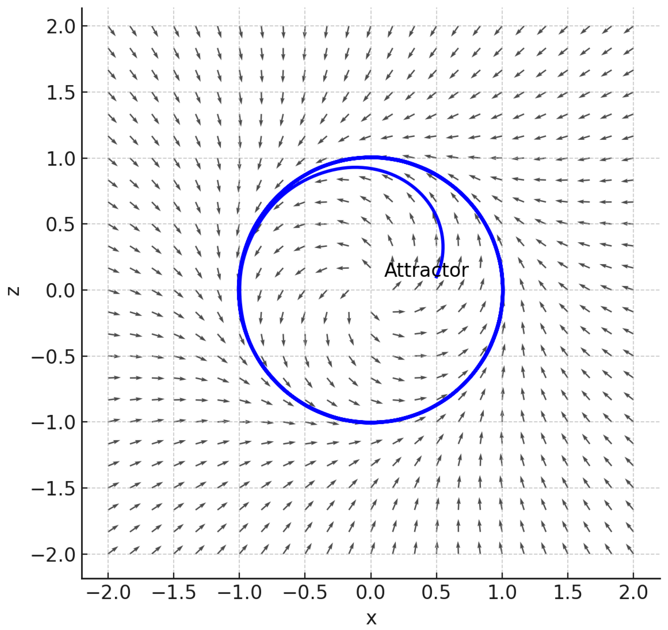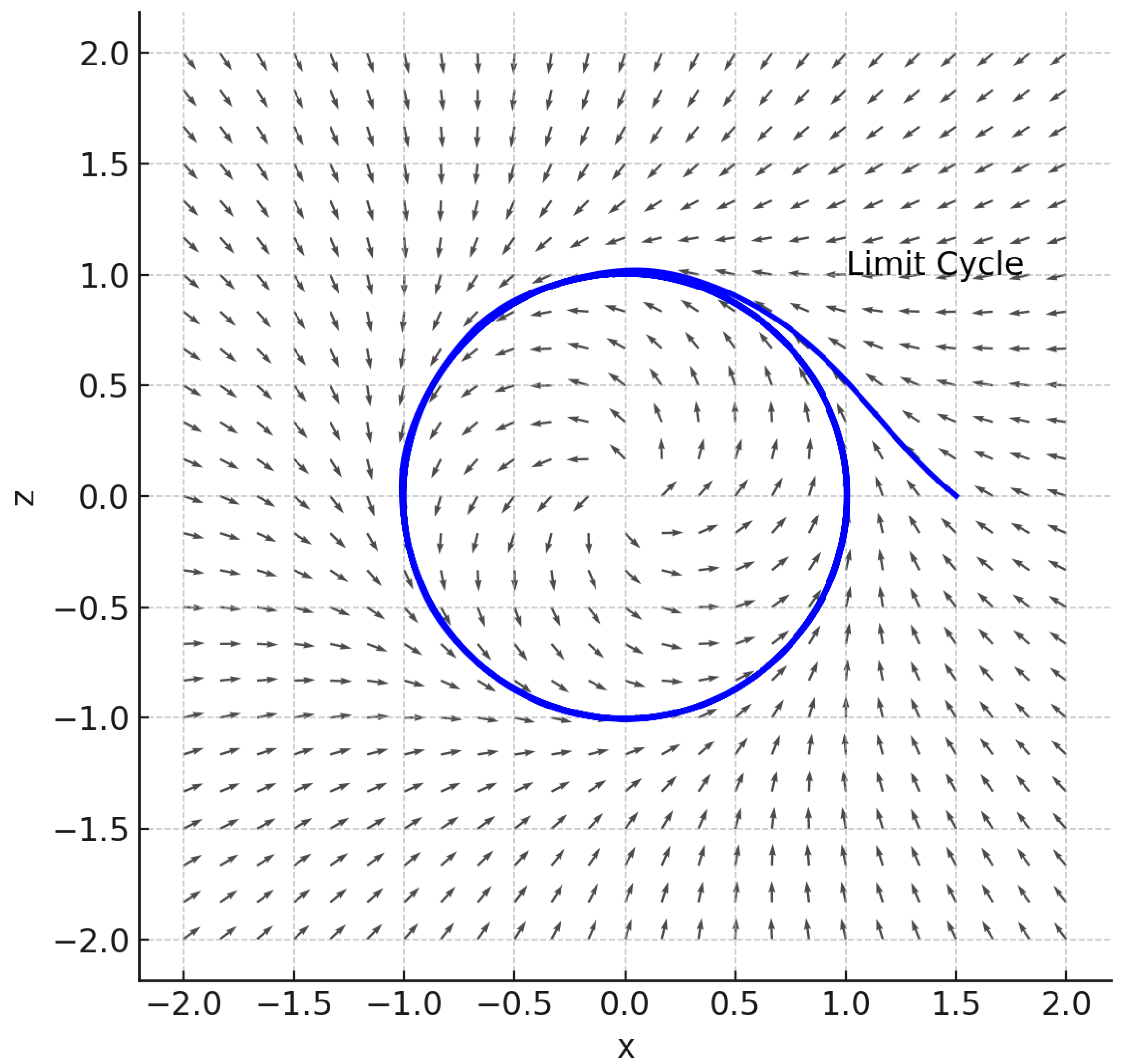 , where the system evolves toward a closed orbit, indicating the emergence of a stable limit cycle. This dynamic regime is a clear signature of a supercritical Hopf bifurcation, in which increasing the memory strength