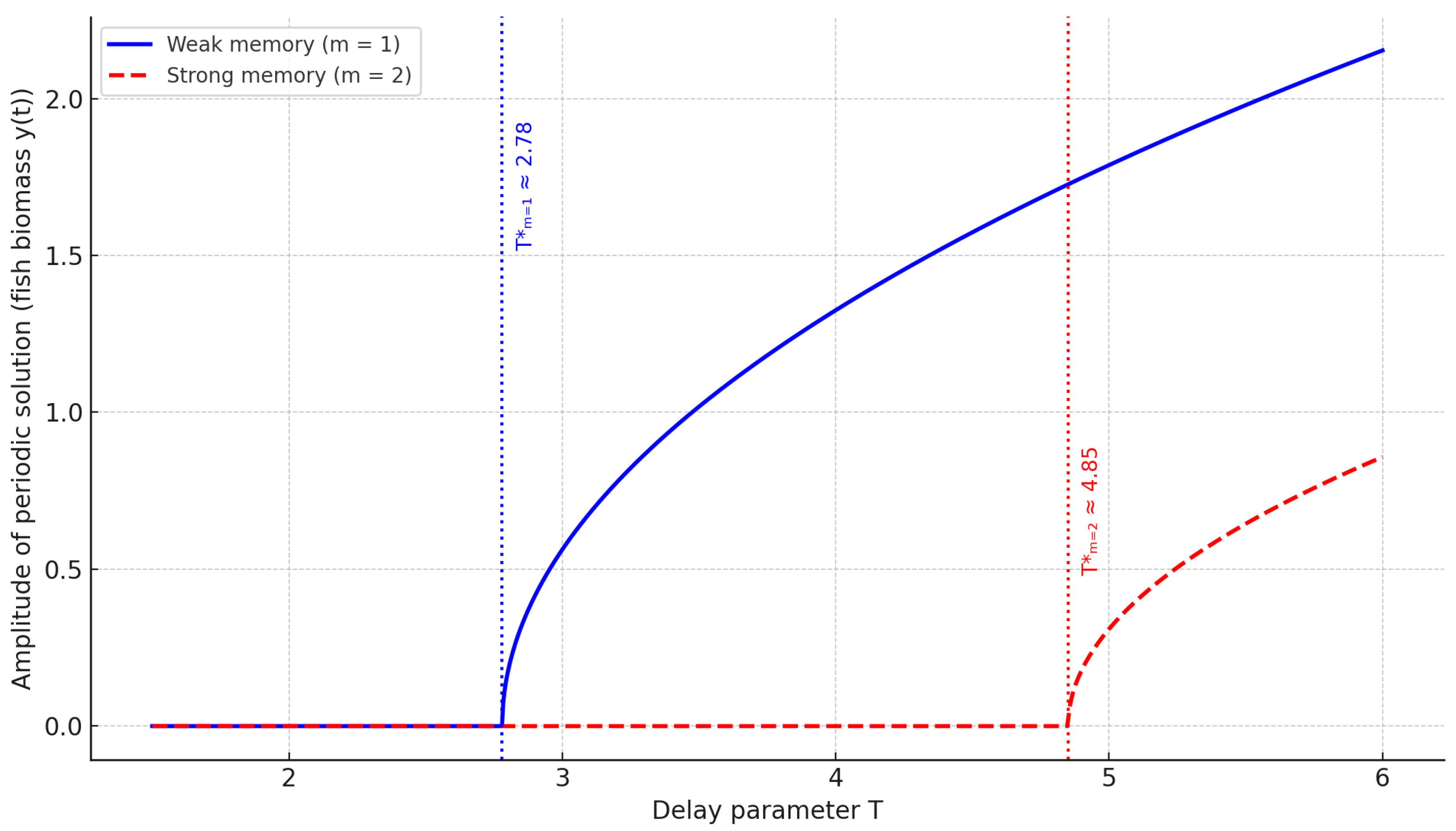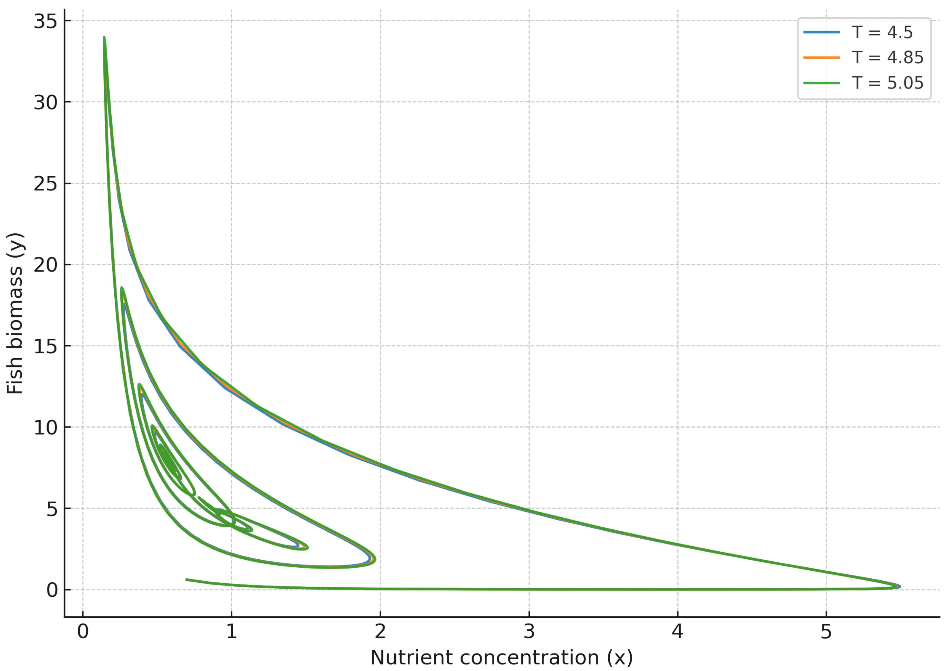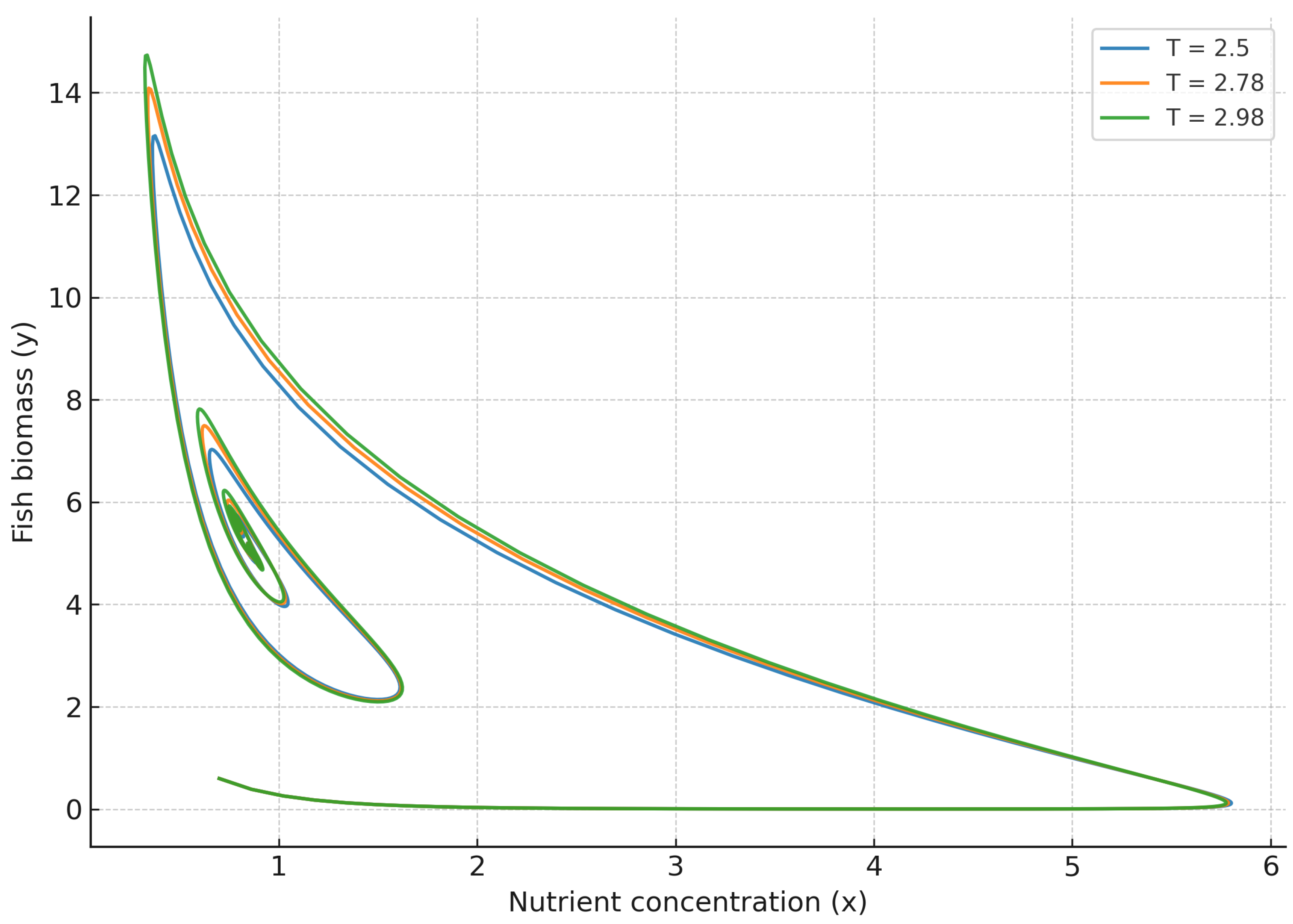 T induces the onset of self-sustained oscillations. The resulting periodic attractor represents a state of long-term coexistence between nutrient concentration and fish biomass, mediated by the delayed feedback introduced through ecological memory. Biologically, this implies that stronger memory effects, such as nutrient recycling or delayed biotic responses, can generate recurrent fluctuations rather than steady equilibrium, enhancing the system’s resilience but reducing its predictability. Overall, the transition from the stable node observed for