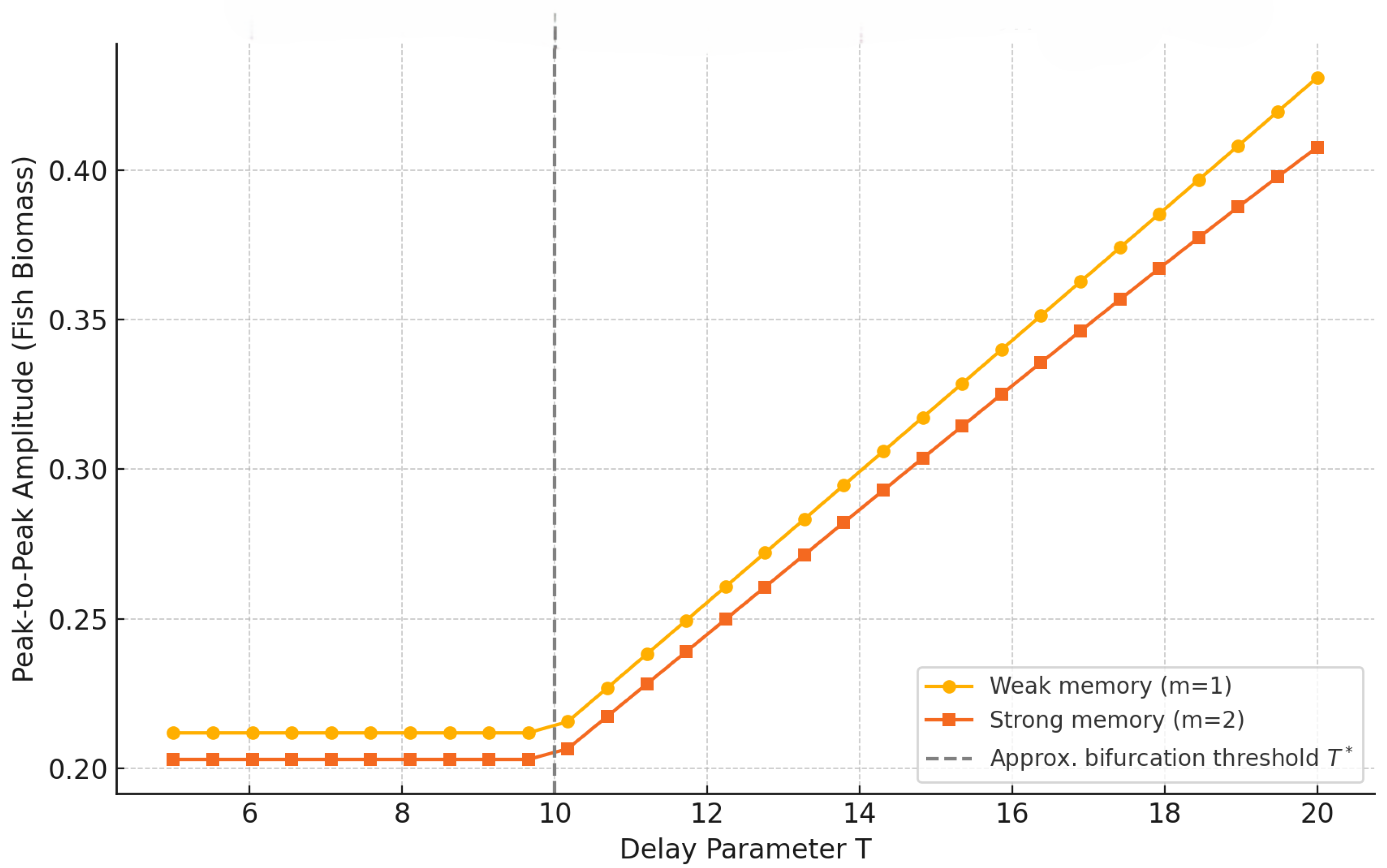 Section 4. Notably, the higher critical delay in the strong memory case reflects the system’s increased ability to tolerate delayed feedback without destabilizing, an outcome that reinforces the stabilizing influence of enhanced ecological memory. To bridge theory and ecological interpretation, we now present a sequence of targeted simulations under both memory scenarios. These results not only validate the predicted bifurcation thresholds but also illuminate the role of distributed memory in shaping system resilience. Each simulation is accompanied by detailed biological commentary to emphasize the implications of memory-driven dynamics in multitrophic aquaculture systems.