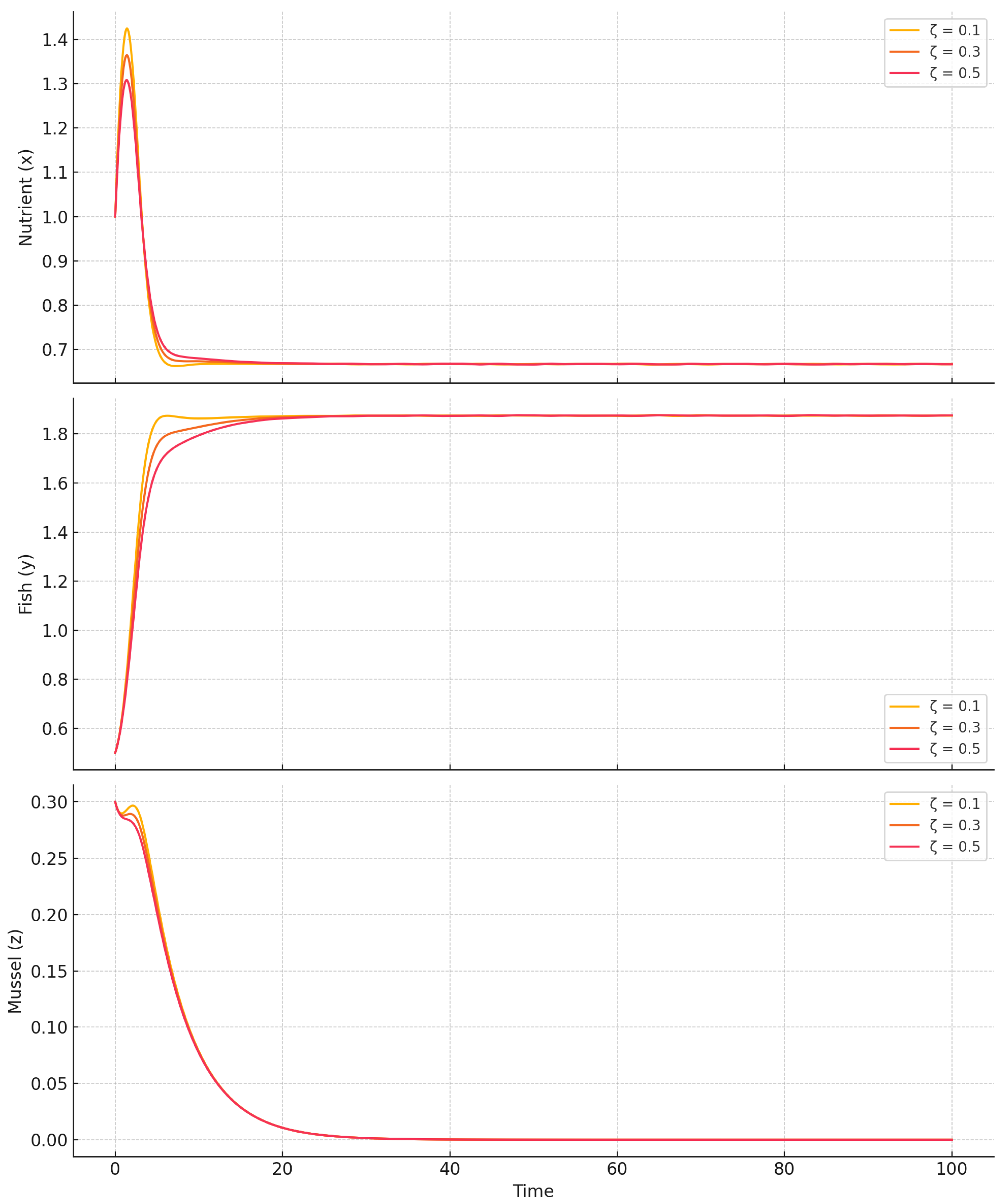 In summary, the simulation results presented in this section serve as a crucial bridge between the mathematical theory and its ecological implications. By systematically varying the delay and memory parameters, we have illustrated how these factors govern transitions between stable equilibria and oscillatory regimes. The bifurcation thresholds identified numerically align closely with those derived analytically, reinforcing the validity of the theoretical framework. From a biological perspective, the findings underscore that ecological memory, modeled here via distributed delay kernels, acts as a stabilizing force capable of mitigating the destabilizing effects of delayed feedback. This highlights the potential of incorporating memory-aware mechanisms into the design of integrated aquaculture systems to enhance their resilience, predictability, and long-term ecological sustainability.
