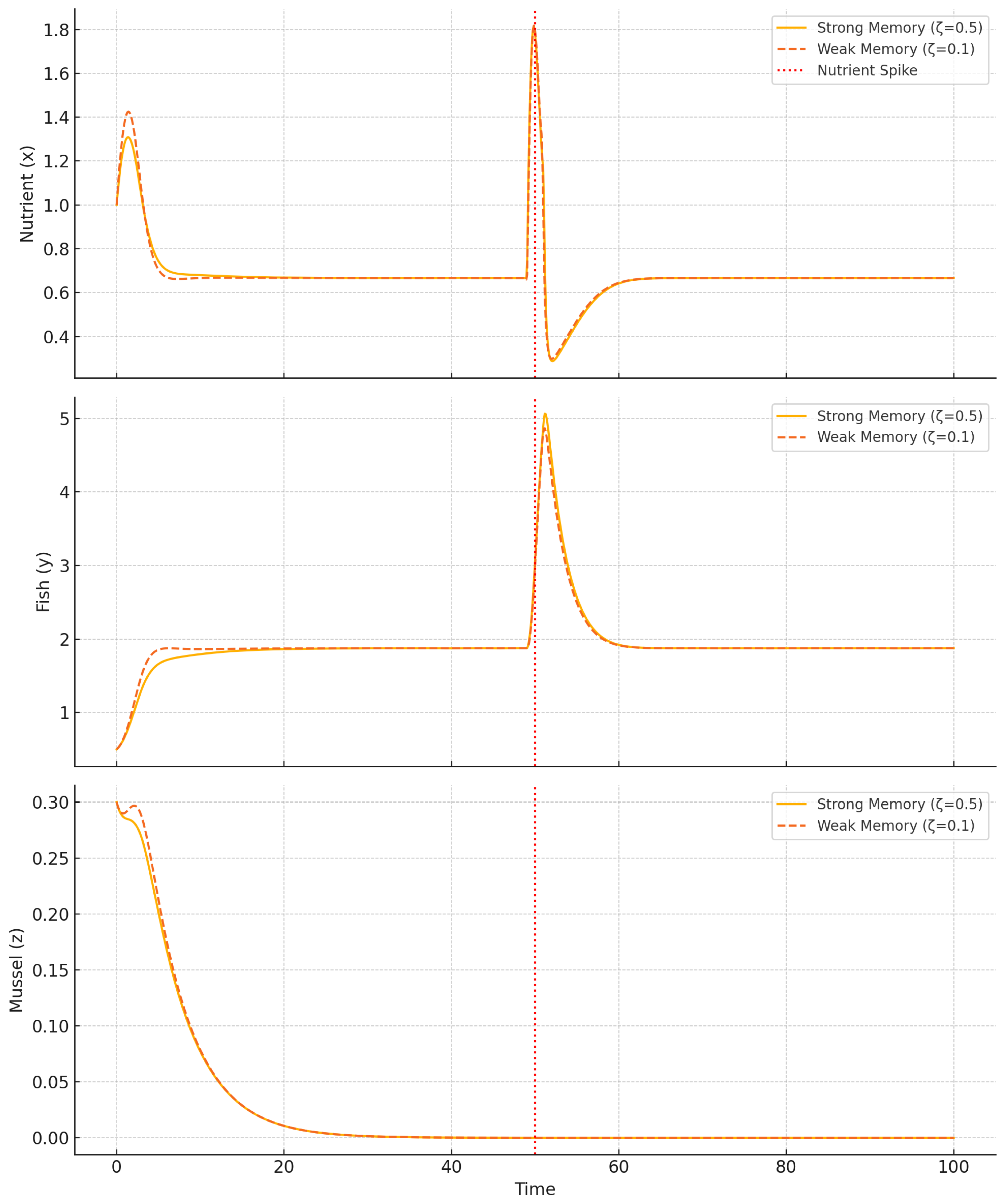Figure 3), the system exhibits persistent, self-sustained cycles in nutrient, fish, and mussel densities, driven by unbuffered delayed feedback. Such oscillations resemble real-world scenarios of nutrient over-enrichment and trophic imbalance in intensively managed aquaculture systems. In contrast, the strong memory case (