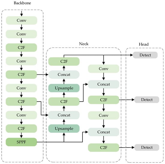 The core part of YOLOv8 is constructed by the C2F module (as shown in Figure 2), and it combines gradient segmentation connections. It achieves efficient feature extraction while controlling the parameter quantity. The Conv module is responsible for adjusting the resolution and channel number of the feature map, and the SPPF module enhances the model’s receptive field and robustness through multi-scale pooling operations.