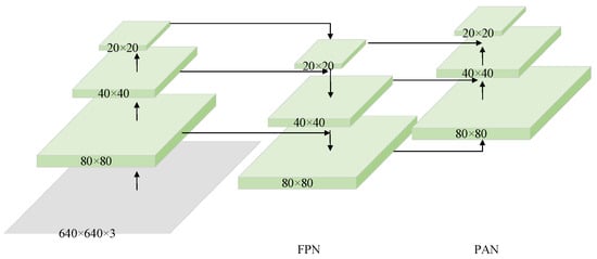 The neck part adopts a simplified PAN structure, and achieves bidirectional fusion of deep and shallow layer features through the feature pyramid architecture. This not only expands the receptive field but also enhances the adaptability to multi-scale targets. Its network structure is shown in Figure 3.