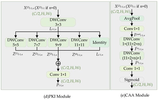 Conventional large-kernel and dilated convolutions often struggle with the significant scale variations in black smoke detection, typically introducing noise or sparse features. To overcome this, we introduce a multi-scale feature extraction method that replaces the standard C2F module’s Bottleneck with a PKI-Block. This enhancement allows the network to better capture multi-scale smoke characteristics, thereby improving the detection of targets with blurred edges and diverse shapes. The core component PKI-Block (consisting of the PKI Module and the CAA module) is elaborated in detail in Figure 5. The proposed architecture of PKI-C2F is shown in Figure 6.