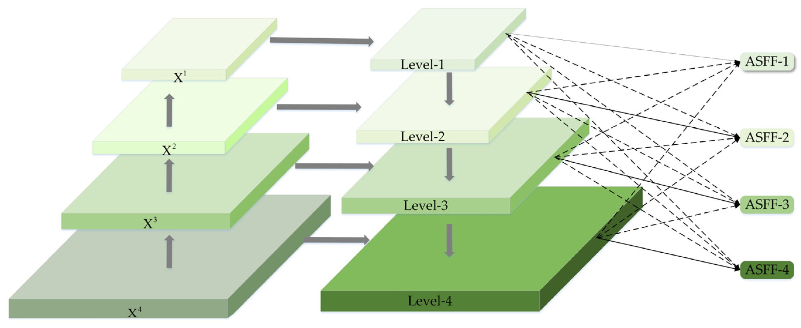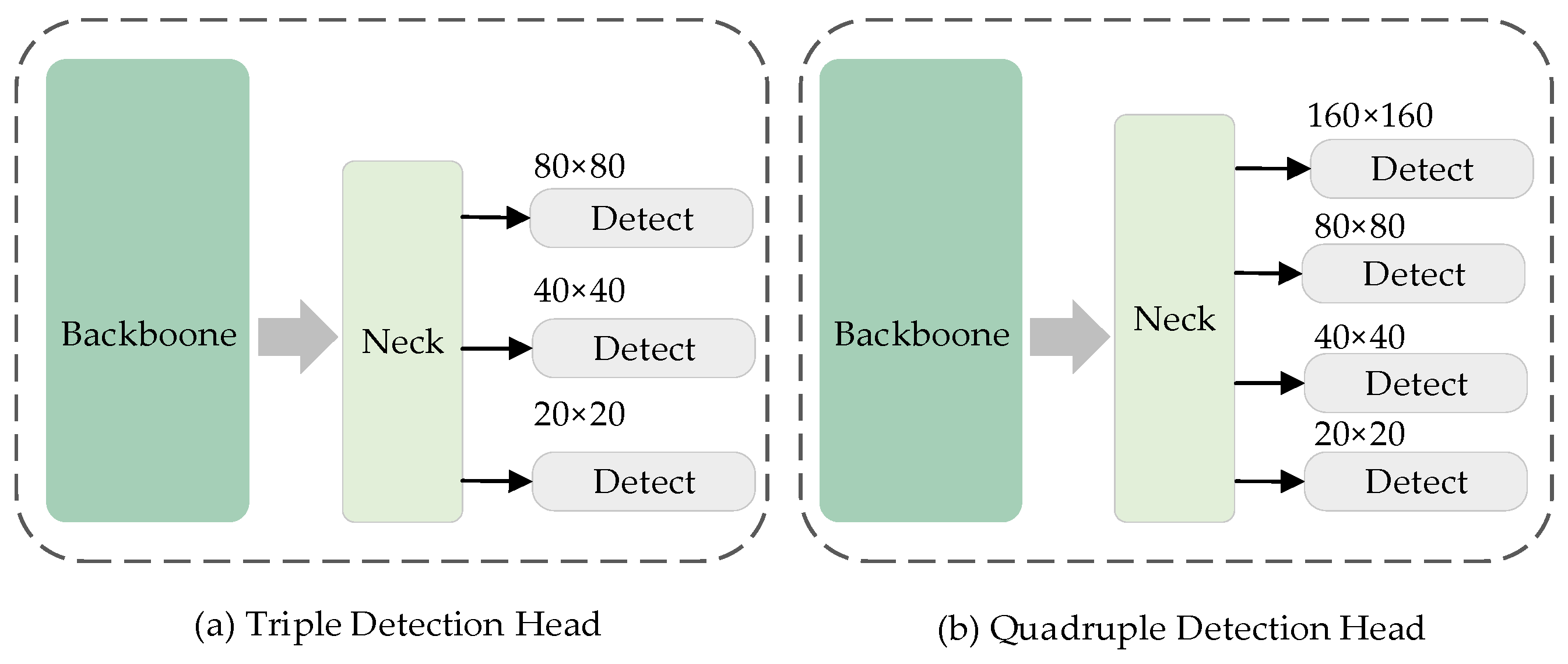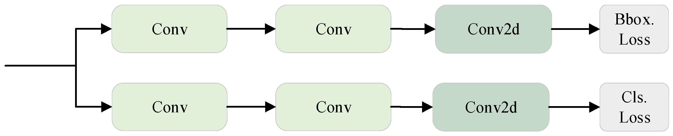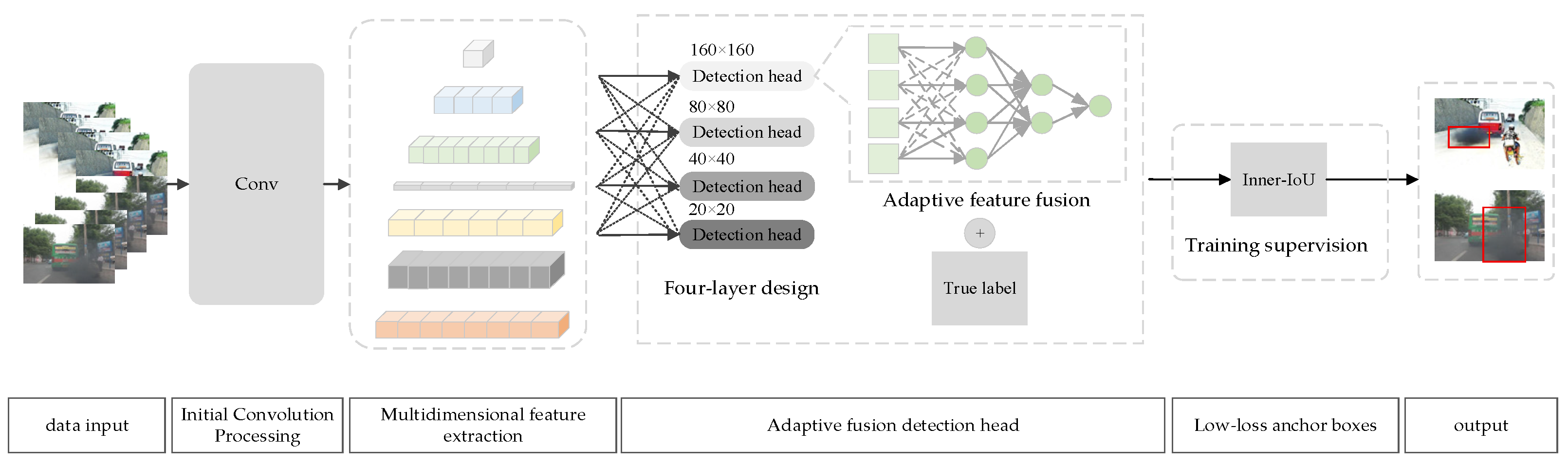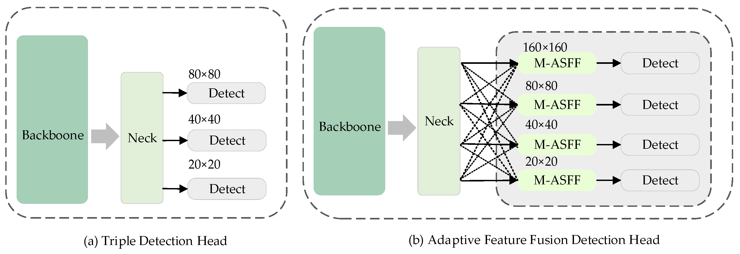 An adaptive feature fusion detection head was constructed. To further improve detection accuracy, the feature fusion mechanism in the real-time object detection network was enhanced by introducing an adaptive feature fusion detection head. This component automatically adjusts the fusion strategy for features across different dimensions, filters out conflicting information, and suppresses interference between feature channels, thereby improving the network’s invariance in multi-dimensional feature extraction. In addition, a four-head design was implemented to strengthen the detection capability for small black smoke targets.