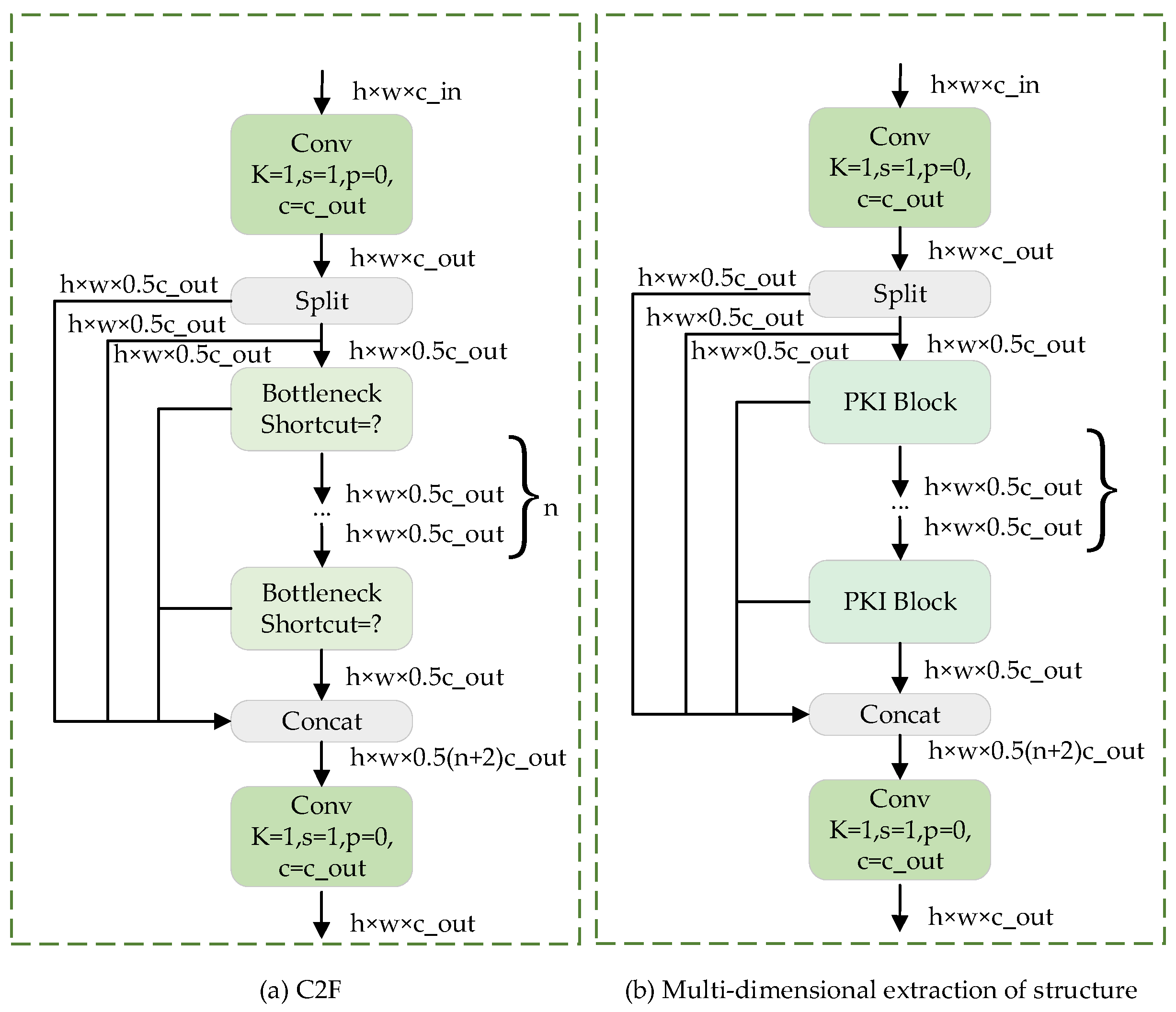 A multi-dimensional feature extraction method was proposed. To address the significant variation in target dimensions of black smoke, the original C2F module in the baseline network was replaced with a multi-dimensional feature extraction structure. This method enhances the model’s ability to capture multi-scale features by expanding the receptive field, significantly improving detection performance for black smoke targets. By integrating contextual features from both smoke patterns and background information, it effectively mitigates the low localization accuracy caused by the high variability in target dimensions and complex edge shapes of black smoke.