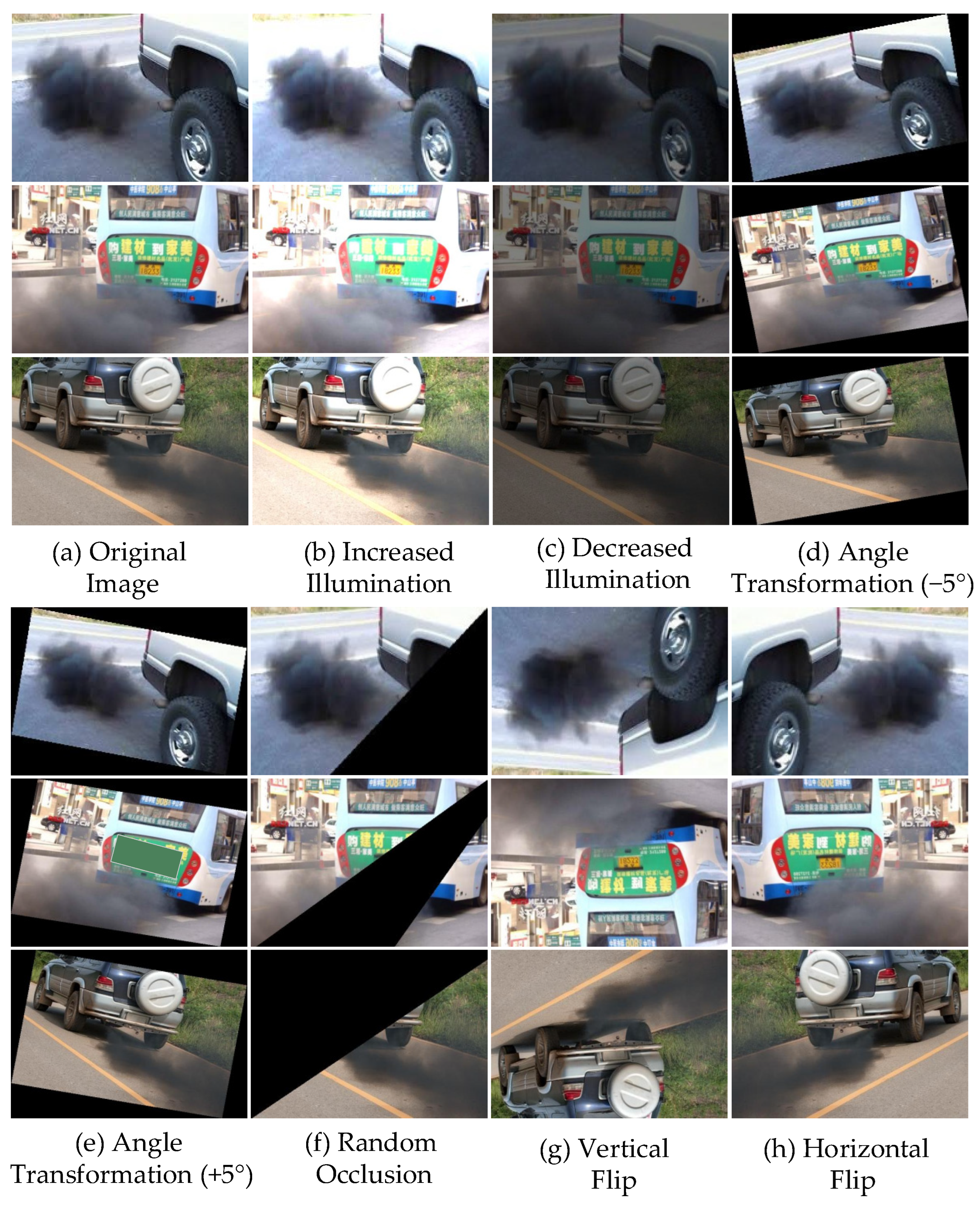 Since no public smoke dataset is available for deep learning-based smoke detection, a custom dataset was constructed in this study. Various smoke images and videos were collected from online sources and expanded to 5000 images through data augmentation techniques. This dataset is referred to as the Smoke-X dataset. To meet practical monitoring requirements, images were collected according to the following criteria. First, the dataset includes scenes under various lighting conditions to simulate real-world environments. Second, the collected smoke images cover diverse and representative scenarios that align with actual situations. Following these criteria, images were collected under various lighting conditions, including large-target smoke, small-target smoke, blurred-edge smoke, clear-edge smoke, light smoke, moderate smoke, and heavy smoke.