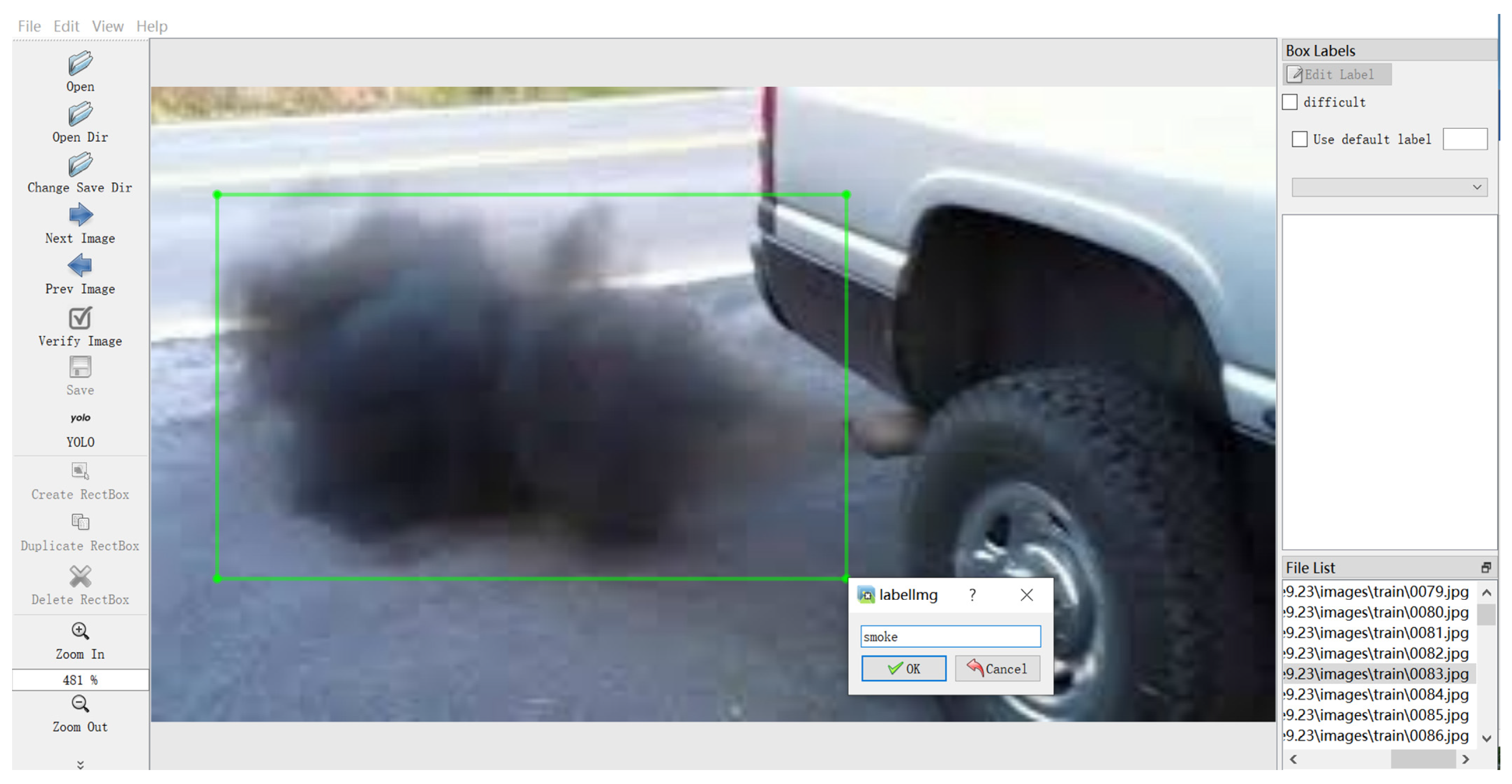 Select the format as “YOLO”. Press the shortcut key “W” to start annotation. Click and drag the mouse to draw a rectangular box to enclose the black smoke area and name it, for example, “smoke”. Click the “OK” button to confirm. The annotation process is shown in