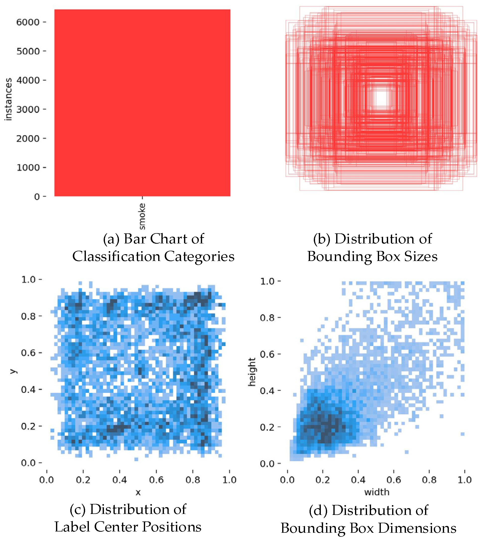 Figure 15c shows the distribution of label center positions, revealing that the smoke targets are relatively evenly distributed across various regions of the images.
