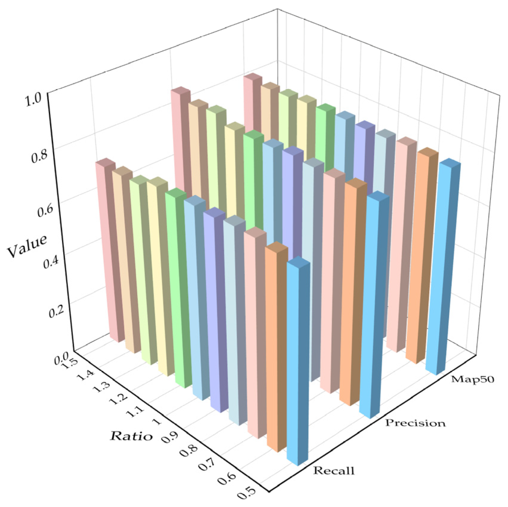 This phenomenon suggests that based on the requirements of the actual task, one can flexibly choose among multiple well-performing and balanced configurations. In practical applications, parameter selection should closely revolve around the task objective: if higher detection accuracy is required, parameters can be adjusted to suppress false positives; if recall rate is the focus, then false negatives should be reduced first; if mAP50 is the core indicator, then a balance between accuracy and recall should be sought. Considering overall performance and common practices, we ultimately set the benchmark ratio value at 0.8. This setting provides stable and balanced performance in most scenarios, maintaining high accuracy and recall rates while also having strong competitiveness on mAP50, which meets the requirements of this project for the model’s universality and stability.