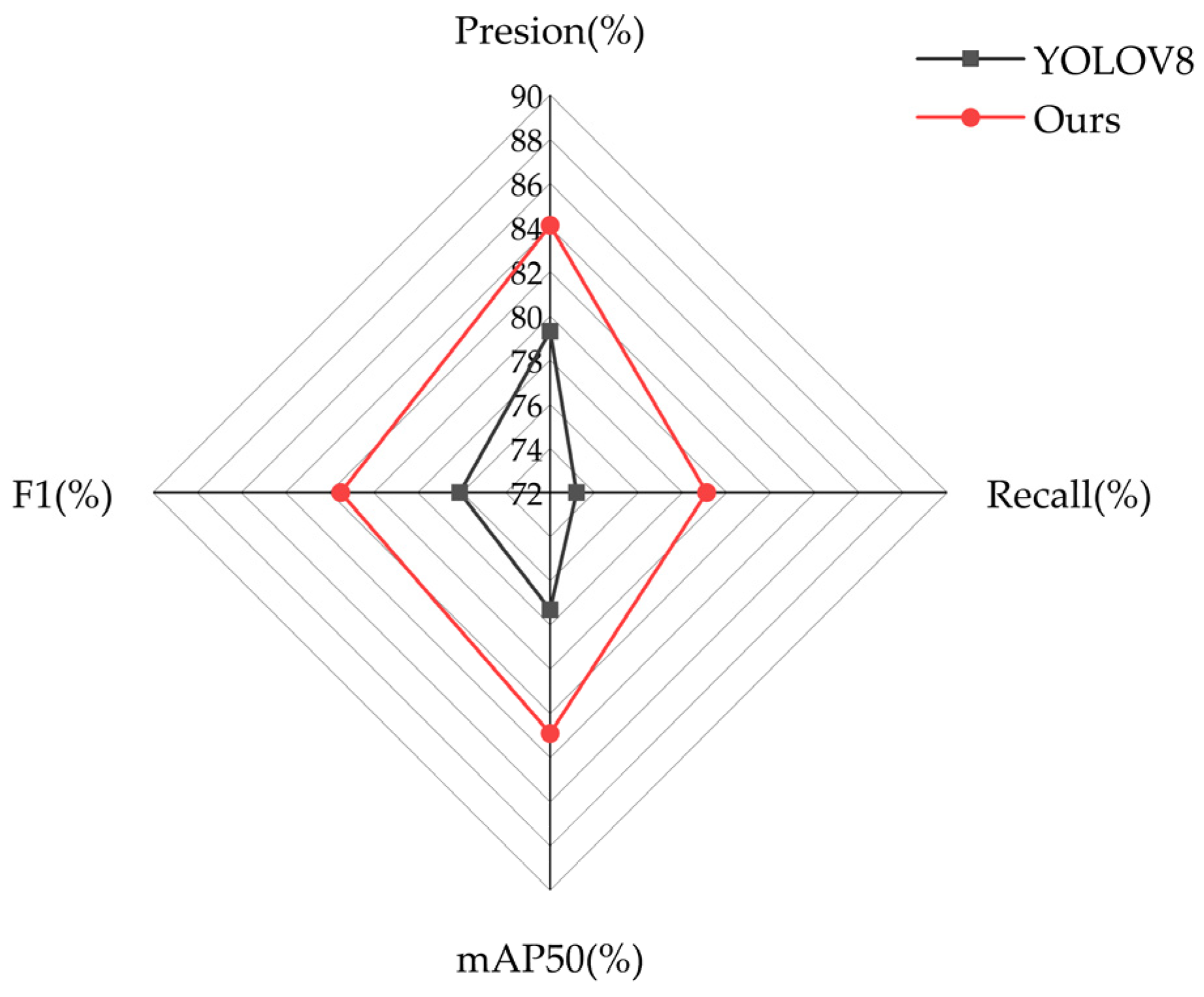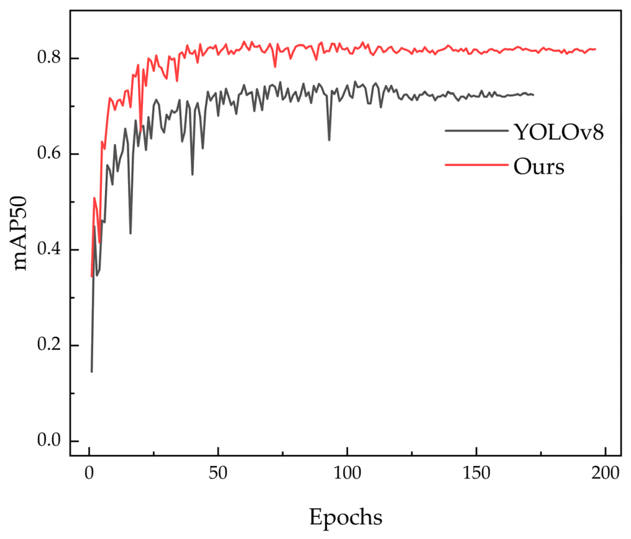 After adding A, B, and C simultaneously, the accuracy, mAP50, and F1 reach the highest values. The temporary mAP50 reduction when combining A and B (77.2%) likely stems from initial feature fusion instability before the addition of component C’s improved localization, which ultimately resolves this issue in the full model (82.9%). In general, the scheme of adding A, B, and C simultaneously is better. Additionally, we conducted a comparative experiment on the original benchmark network and the model with the simultaneous introduction of A, B, and C structures, which are recorded as YOLOv8 and Ours.