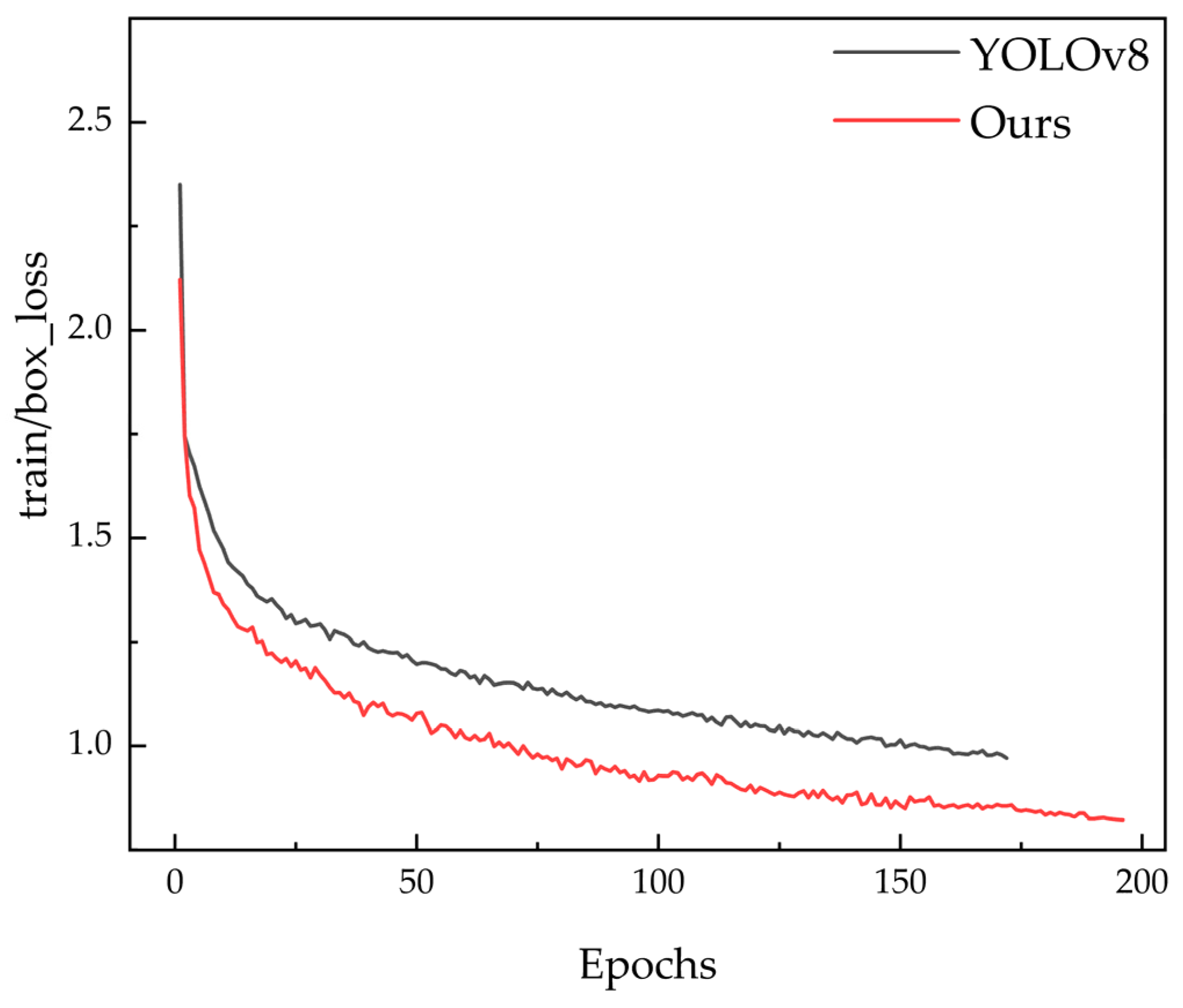 To systematically evaluate the performance of the model, we conducted a comparative experiment on the Smoke-X dataset between the baseline detection network and the improved model. The experiment used the bounding box loss (the bounding box loss during the training process) and mAP50 as evaluation metrics to comprehensively reflect the convergence behavior and final accuracy of the model during the training period. As shown in