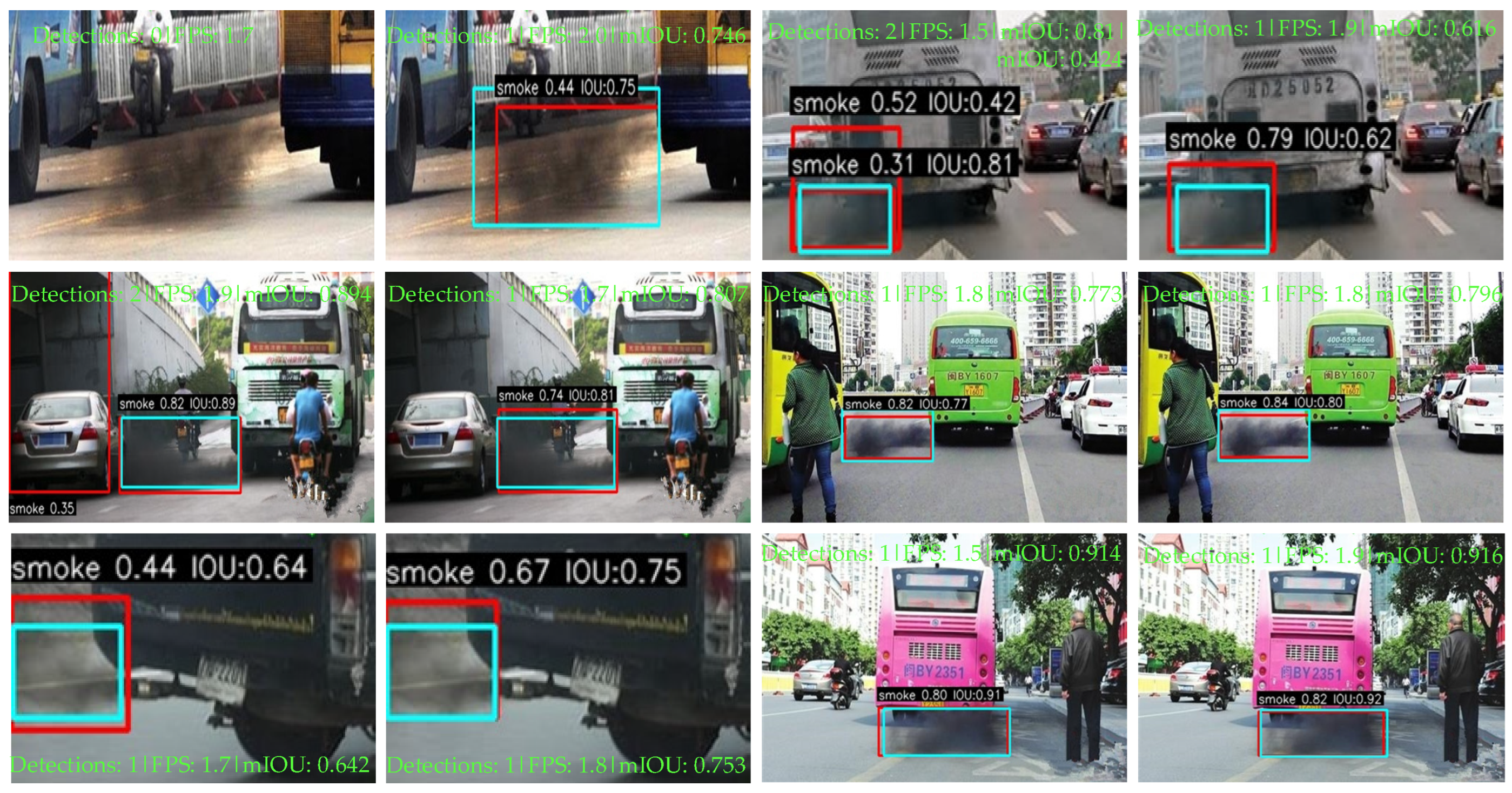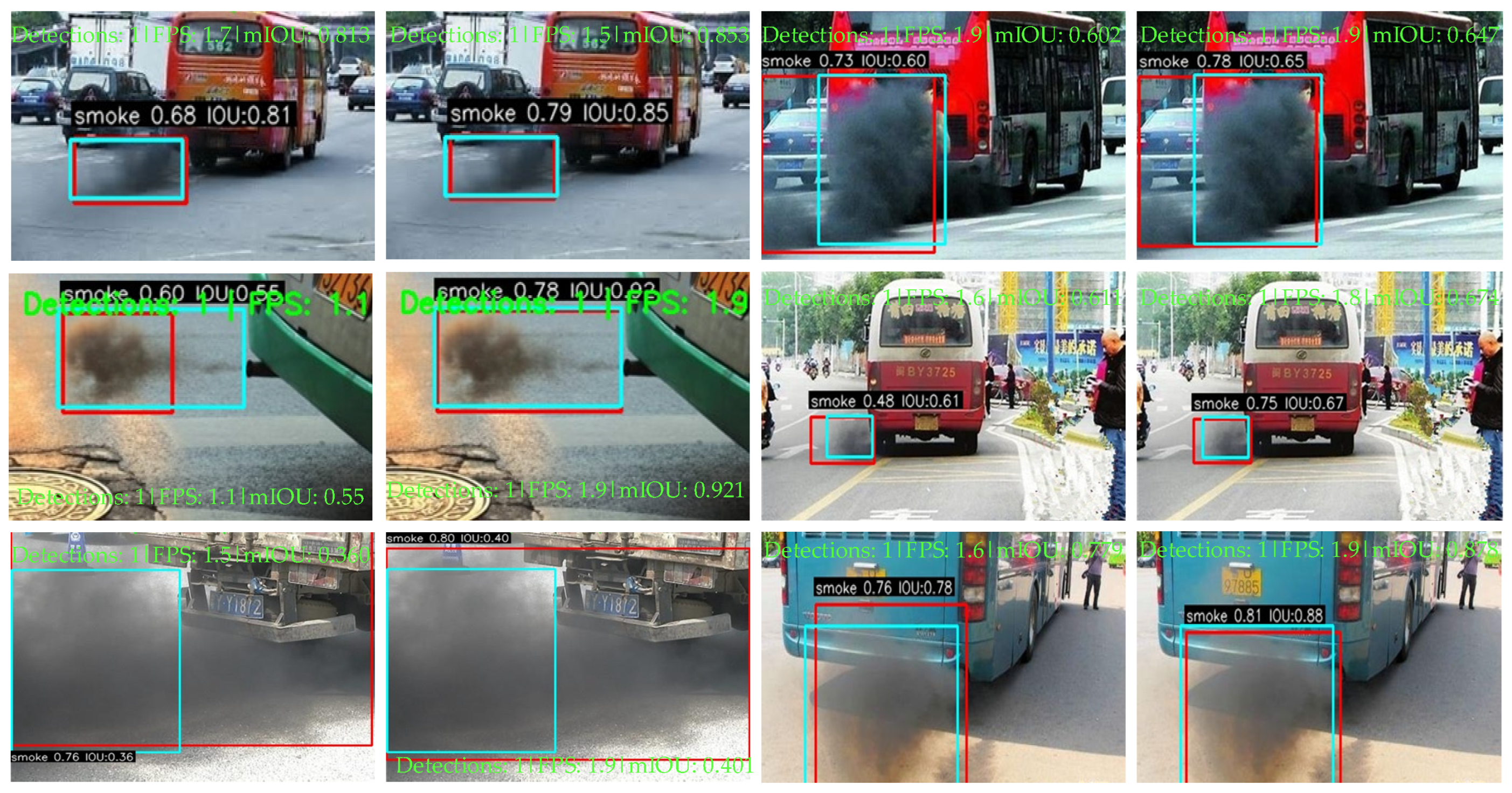 Figure 21 (from left to right, from top to bottom), the improved network successfully detected black smoke targets that were not identified by the original algorithm, thereby reducing the number of missed detections. In the second and third groups of