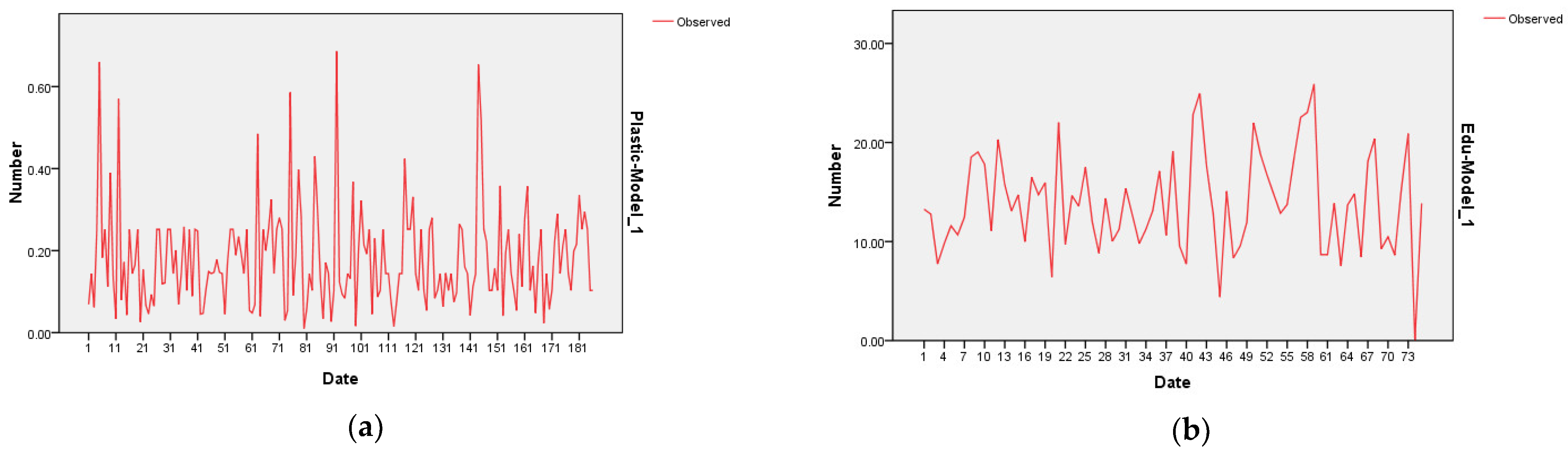 where: μ is constant term, ϕ i is autoregressive coefficients, and ϕ i < 1 at i = 1 , 2 , 3 , , p ,   ε t is random error at time t which is ε t ~ E x p β , d is degree of differencing to achieve stationarity, and B is backshift operator. The differencing process 1 B d is applied first to remove trends or non-stationarity, followed by modeling the differenced series using an A R p structure.