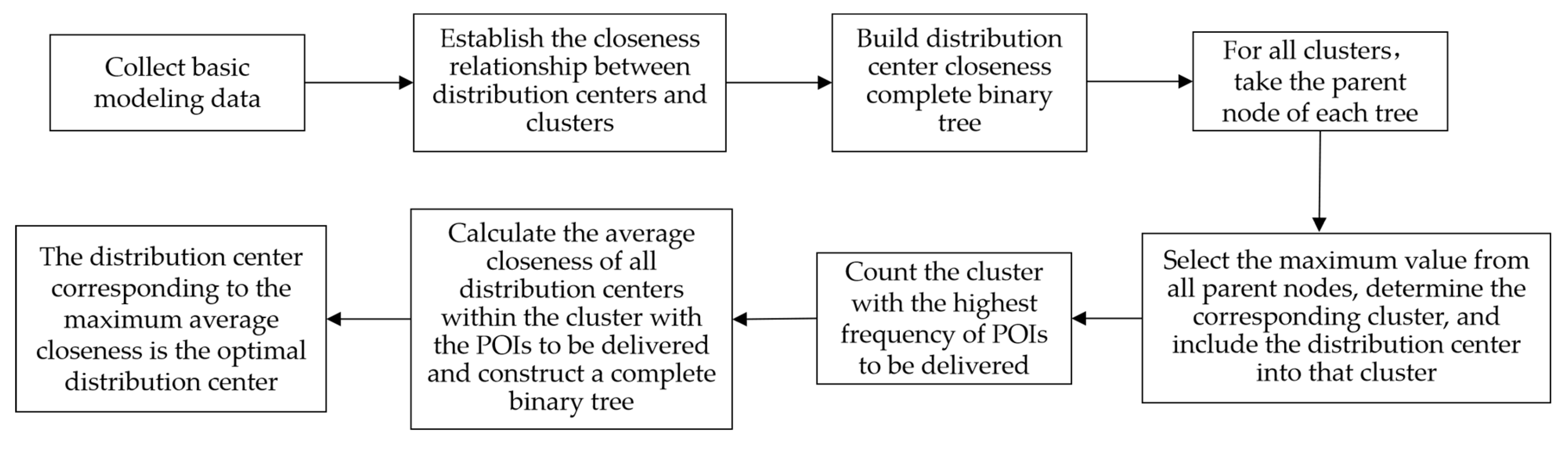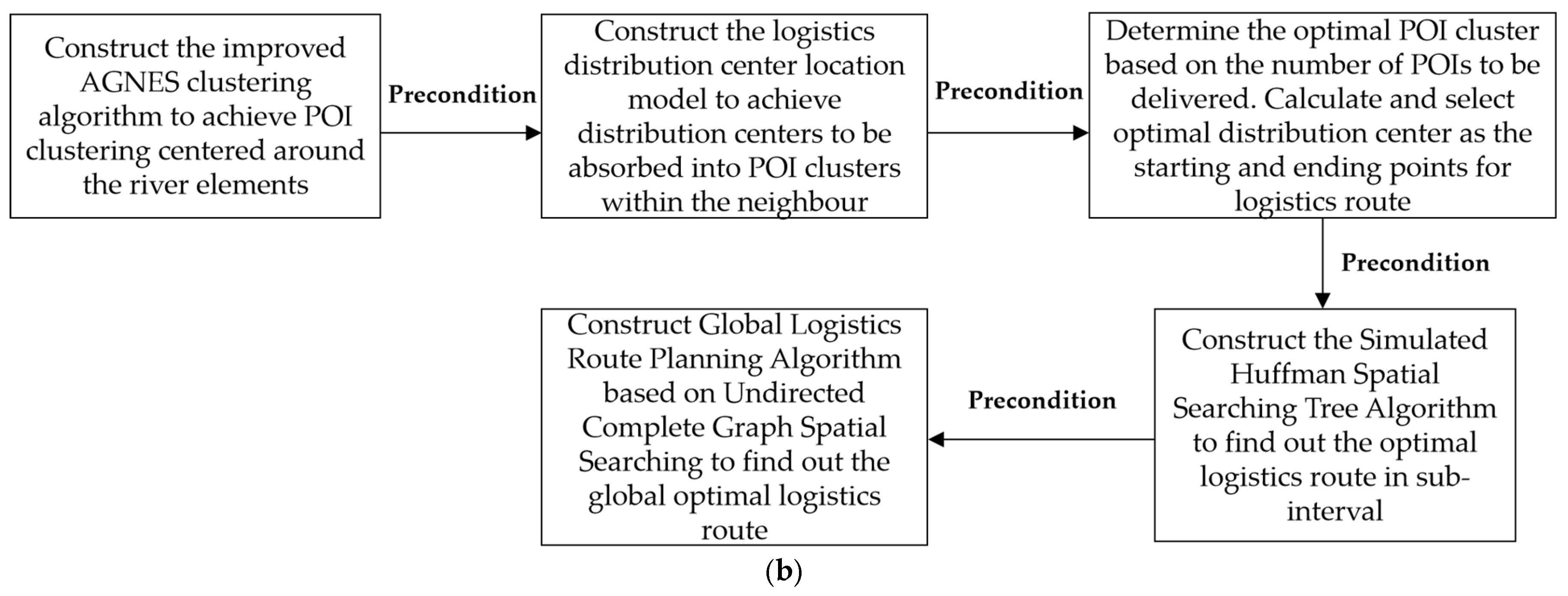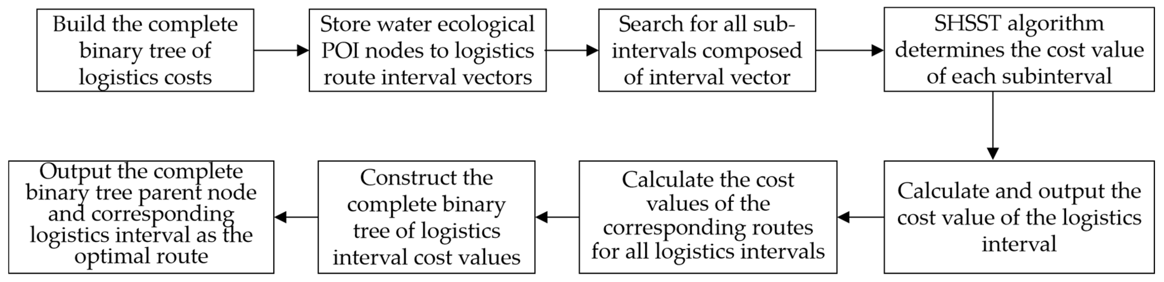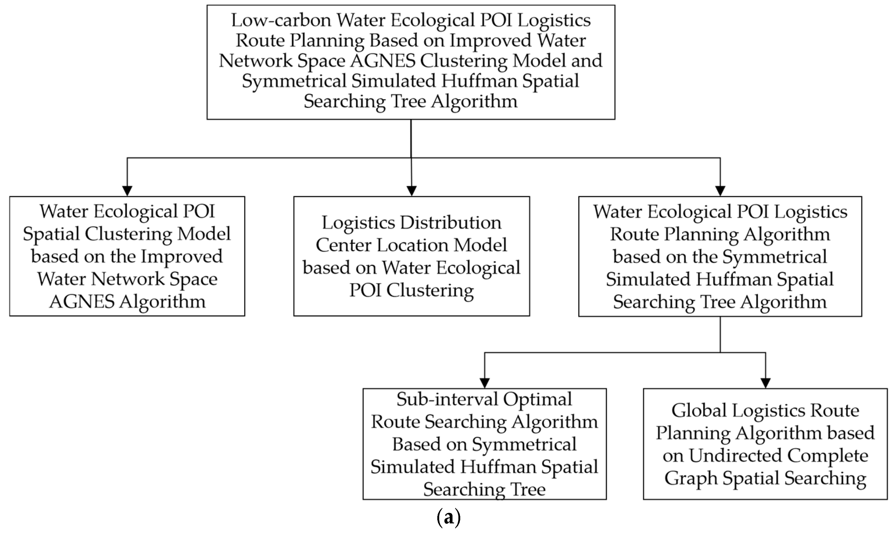 In response to the spatial distribution features of the water ecological POIs and the demands for the logistics route planning, we first construct the clustering relationship model between the water ecological POIs and the water network buffer zones. Secondly, we establish the spatial relationship model between the urban distribution centers and water ecological POIs in each cluster, and search for the optimal distribution center location as the starting and ending points of logistics routes. Based on this, we construct a multi-level logistics route algorithm based on the symmetrical simulated Huffman spatial searching tree algorithm to search for the optimal routes in the logistics sub-intervals and logistics intervals.