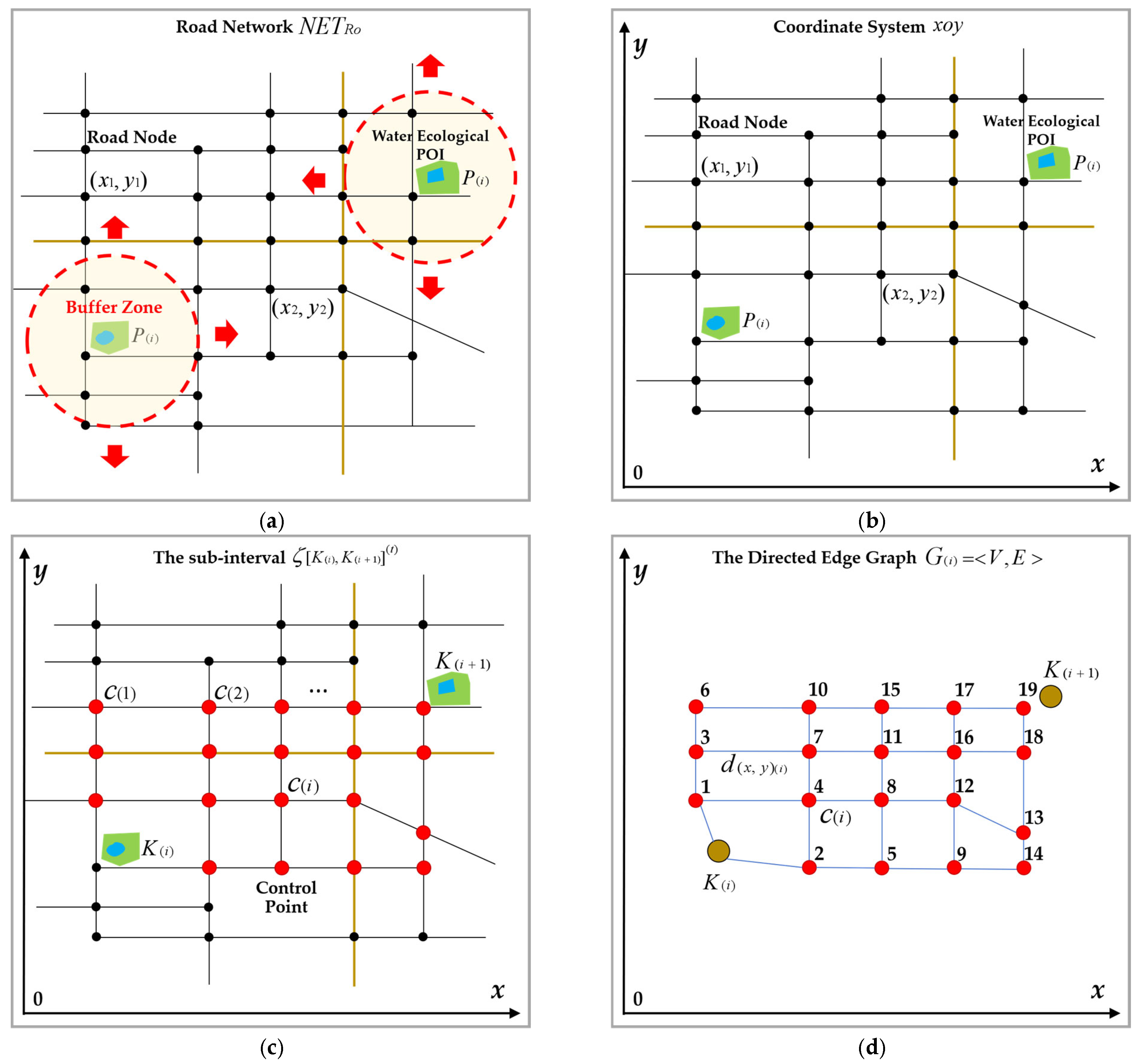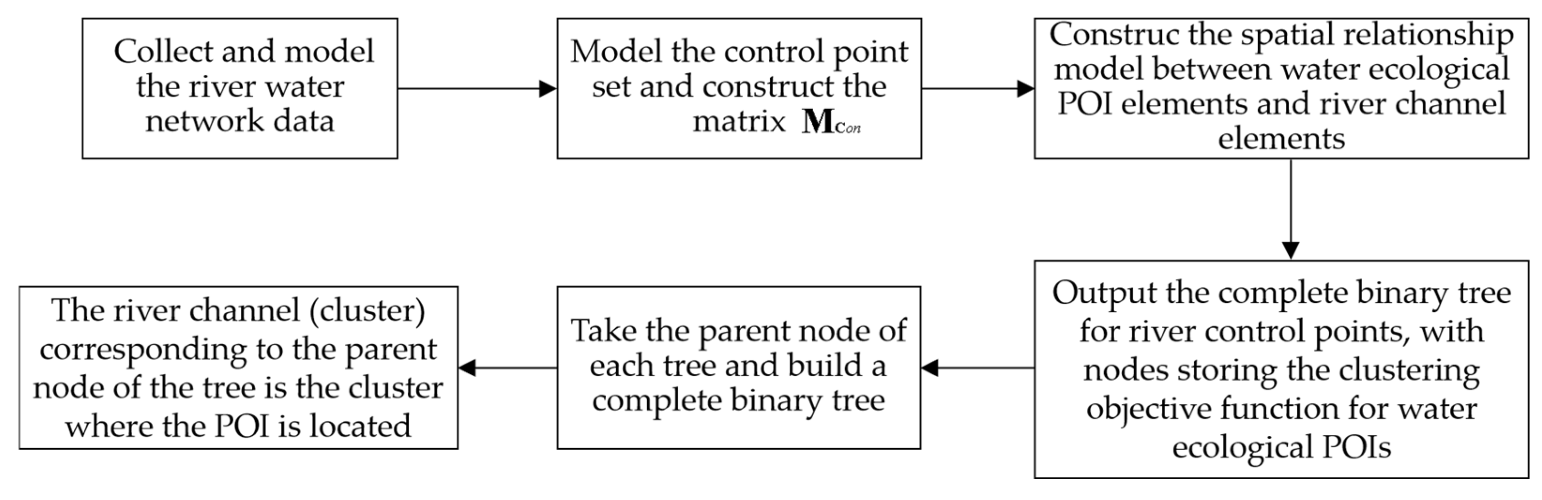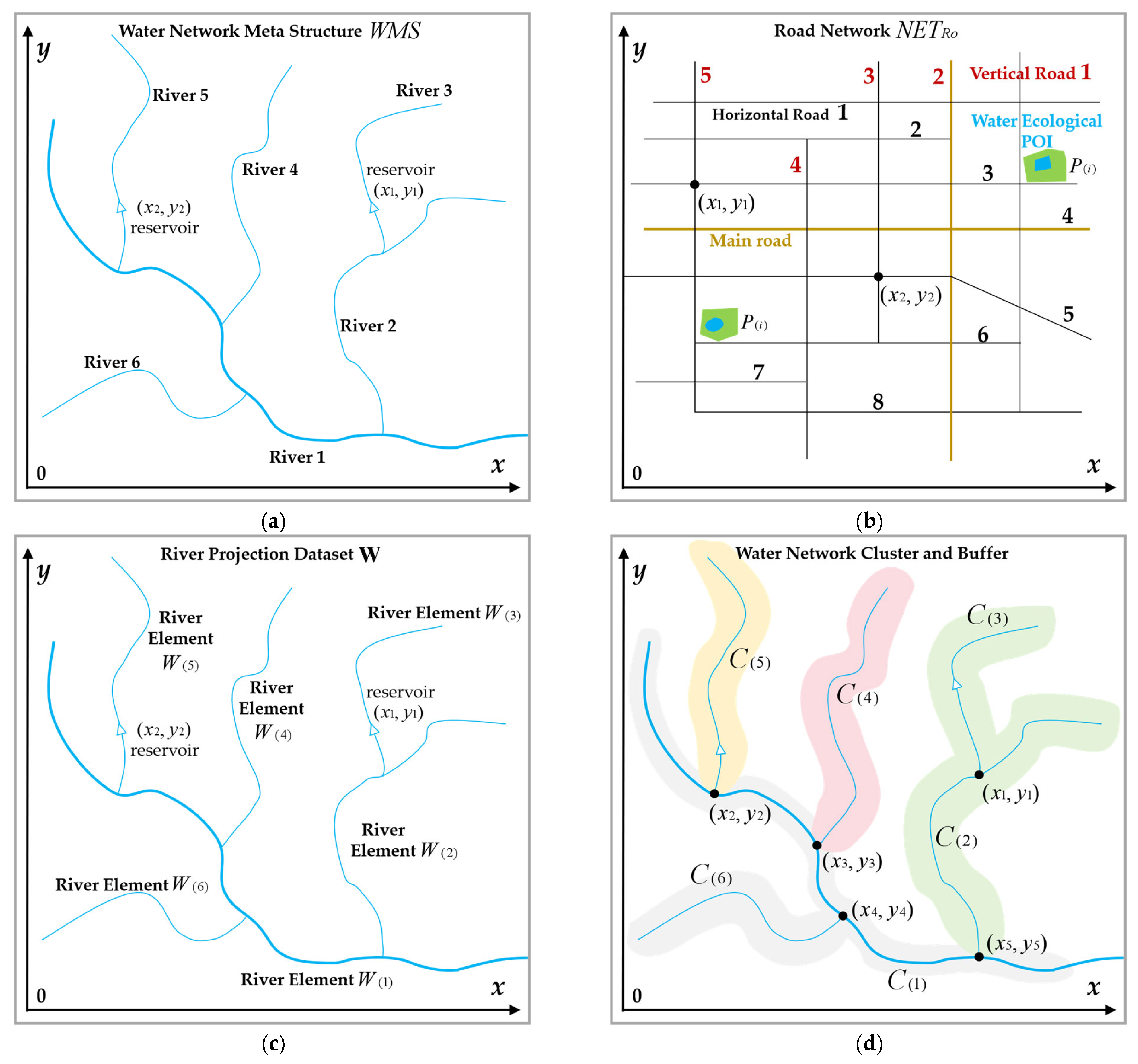 24]. For the water network rivers represented by linear symbols, we selected those with important tourism value and basic water ecological architecture from the urban geospatial environment, and projected them onto the coordinate system to form the meta-structure of water ecological POI clustering. By establishing the urban spatial road network, we constructed the control point set for the main water network meta-structure, and then used the control point set to construct a buffer zone for the main water network meta-structure. Then, the improved AGNES clustering algorithm was established to achieve the spatial relationship between the water ecological POIs and control point set, thereby realizing the water ecological POI clustering based on the main water network meta-structure.