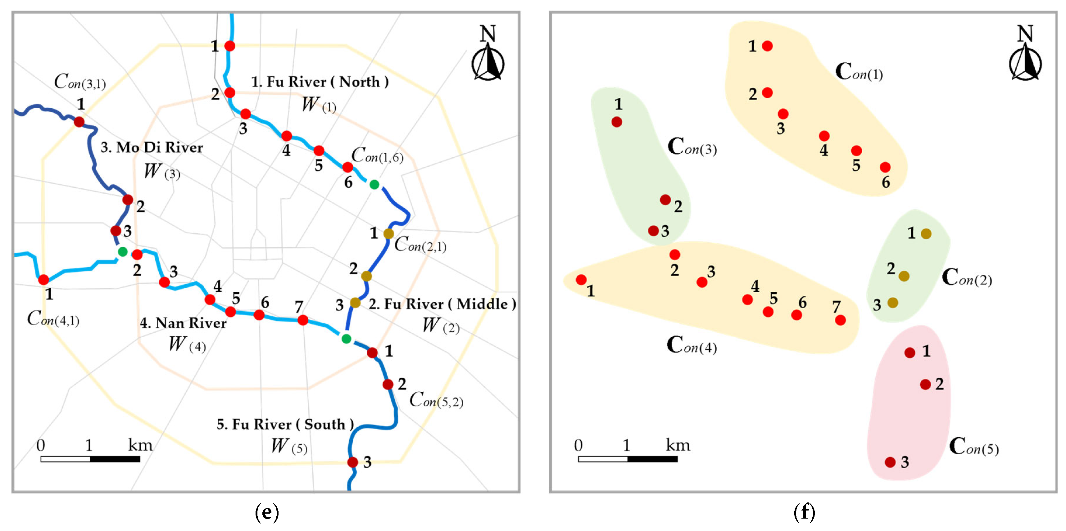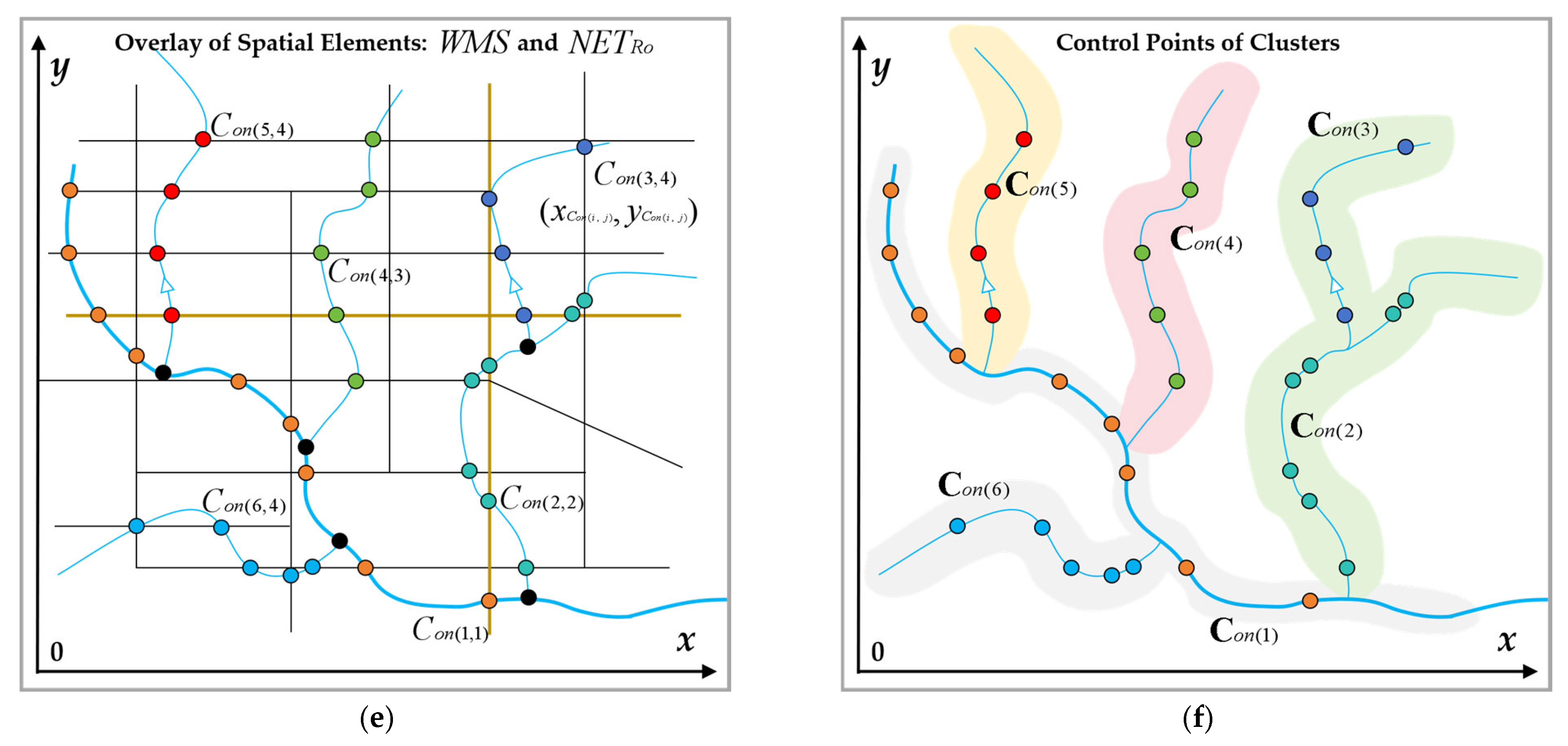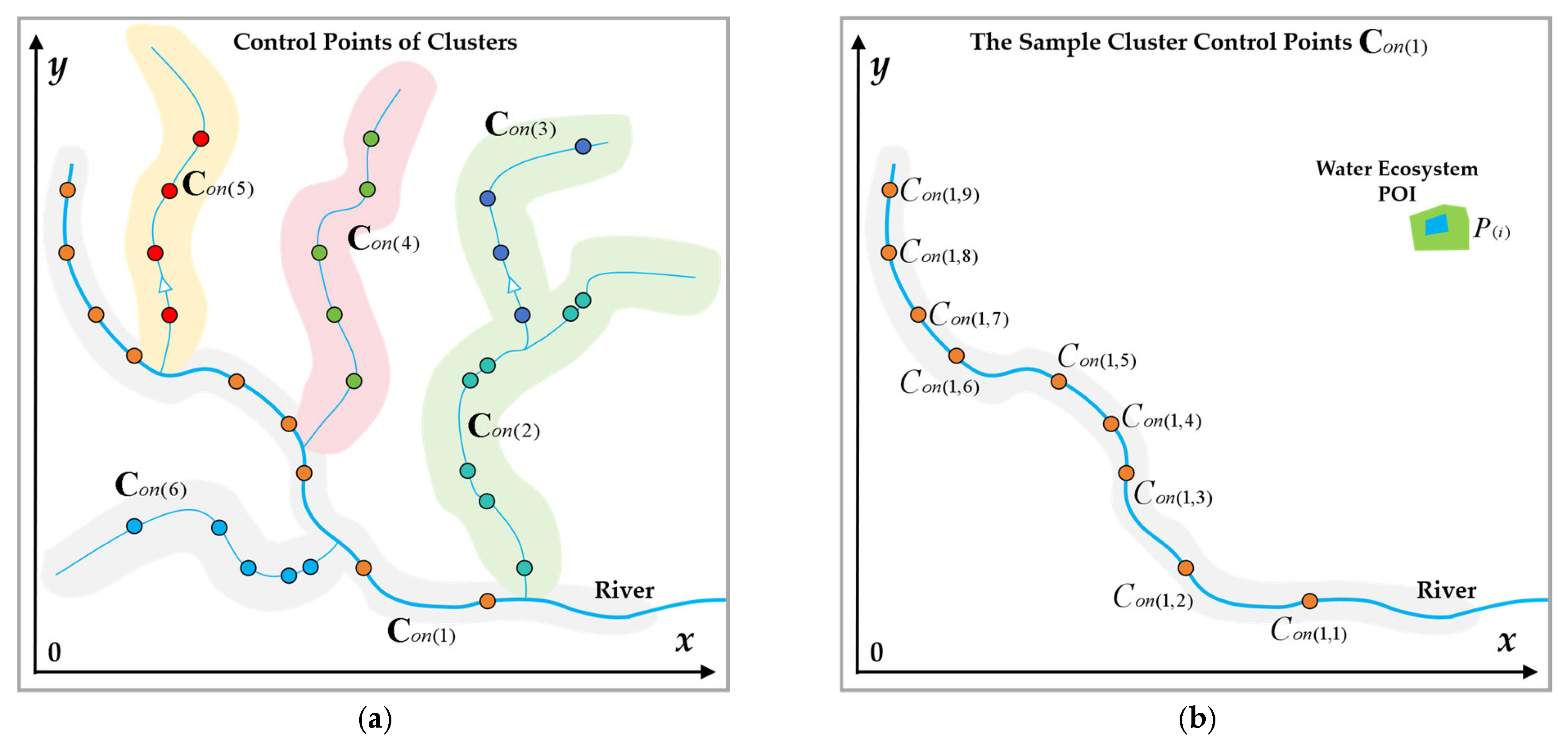 24]. For the water network rivers represented by linear symbols, we selected those with important tourism value and basic water ecological architecture from the urban geospatial environment, and projected them onto the coordinate system to form the meta-structure of water ecological POI clustering. By establishing the urban spatial road network, we constructed the control point set for the main water network meta-structure, and then used the control point set to construct a buffer zone for the main water network meta-structure. Then, the improved AGNES clustering algorithm was established to achieve the spatial relationship between the water ecological POIs and control point set, thereby realizing the water ecological POI clustering based on the main water network meta-structure.