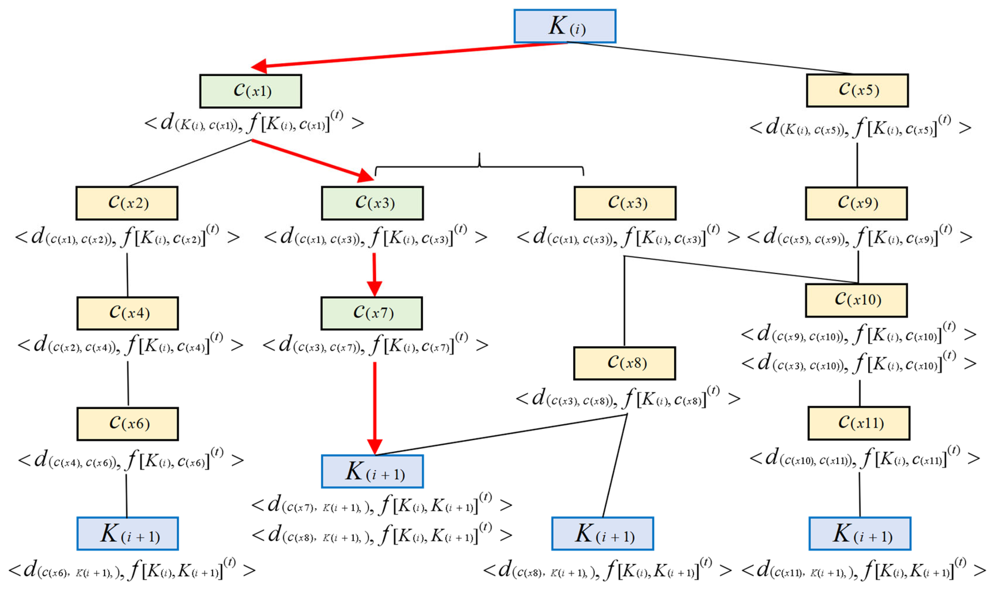 (6) When the traversal is complete, , the binary tree is stored and forms a large tree. The function value stored in the current parent node is the optimal spatial relationship value between the POI element and river element , denoted as .